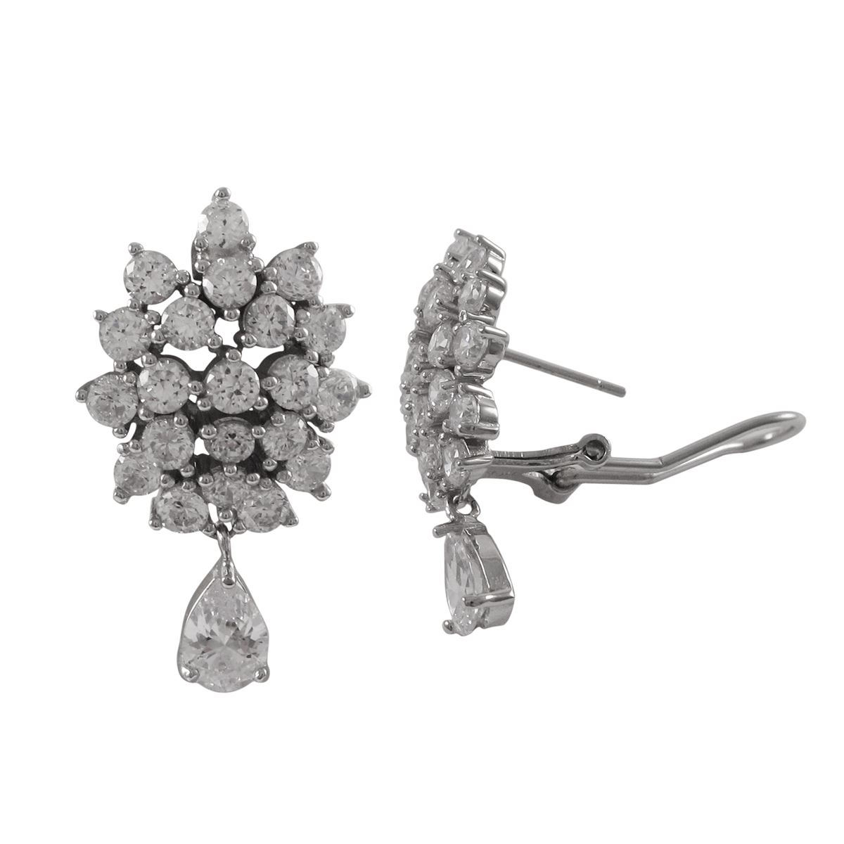 Sterling Silver CZ Cluster With Dangling Teardrop CZ Post Clip Earrings, 1.14"