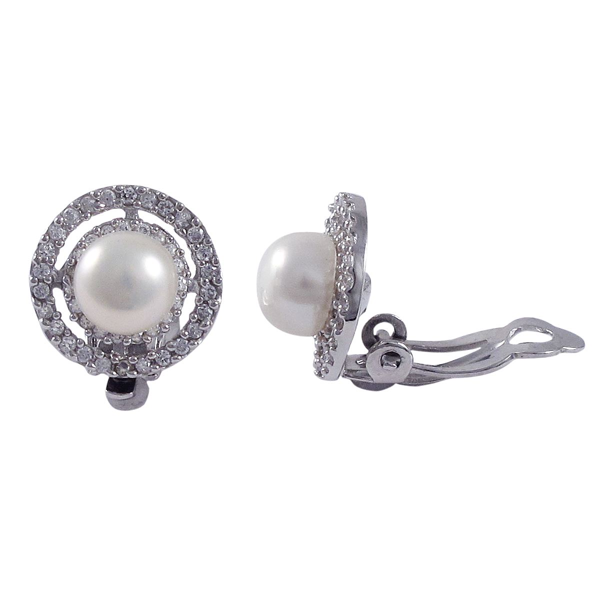 Sterling Silver CZ With 8Mm White Pearl Clip Earrings- 0.56"