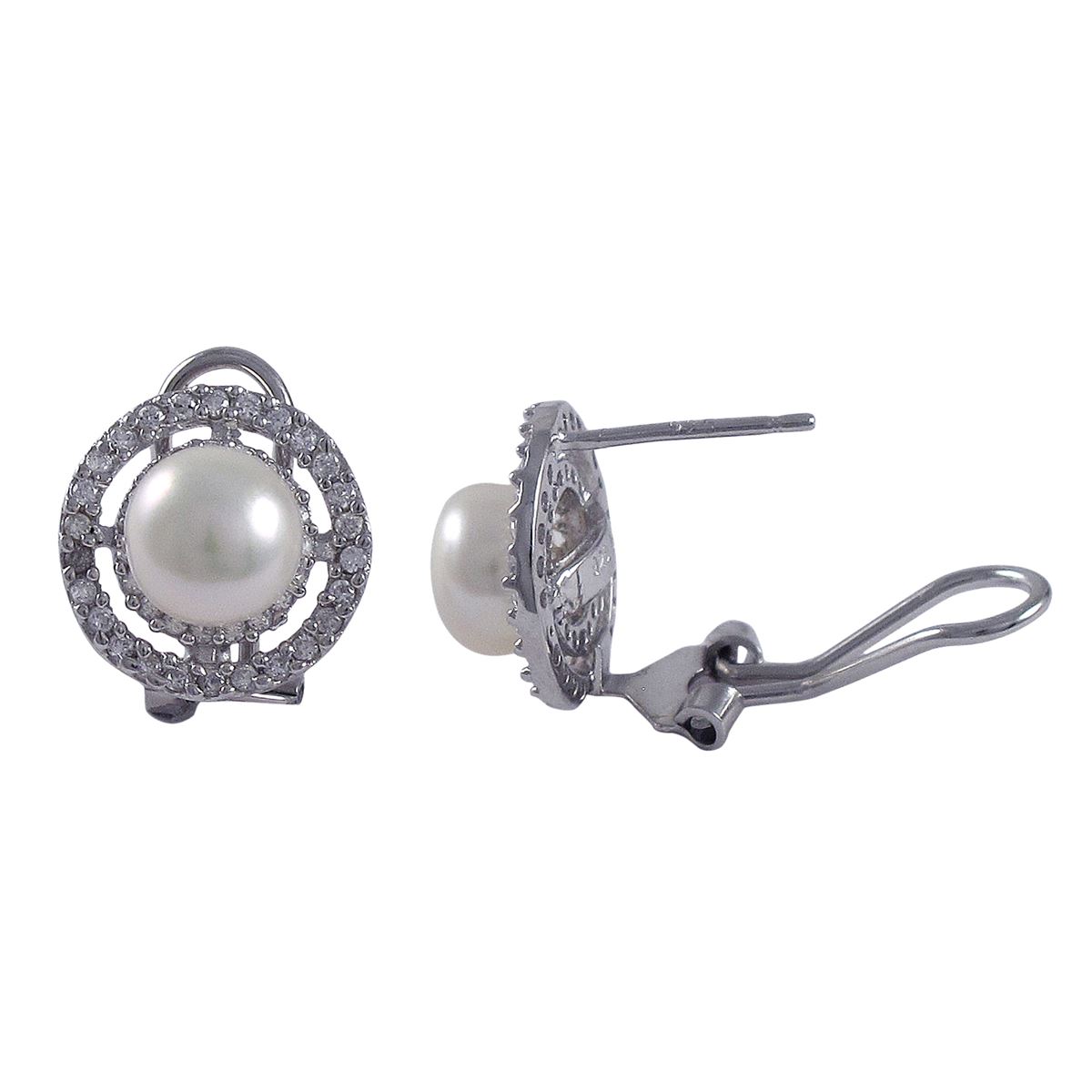 Sterling Silver CZ With 8Mm White Pearl Post Clip Earrings- 0.56"