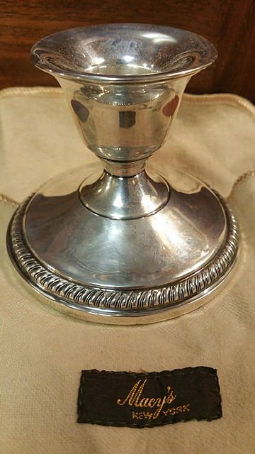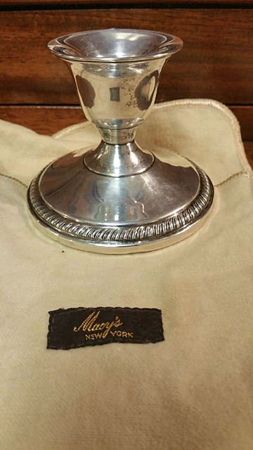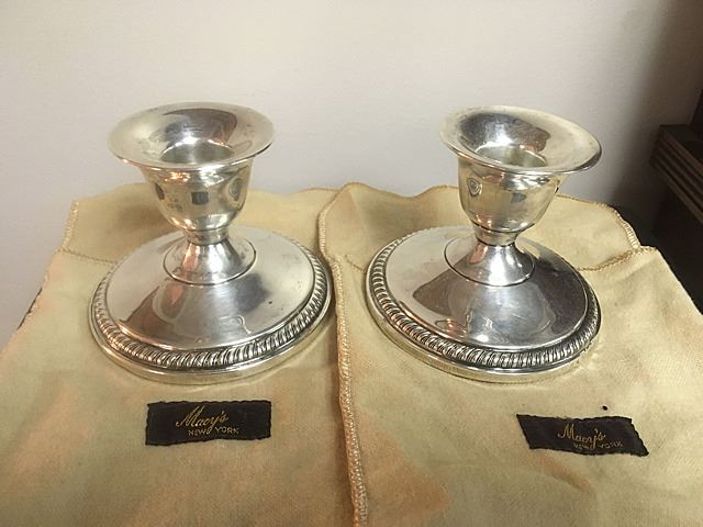 Pair of Sterling Silver candle holders from Macy's of New York with original pouches for storage, marked Macy's.