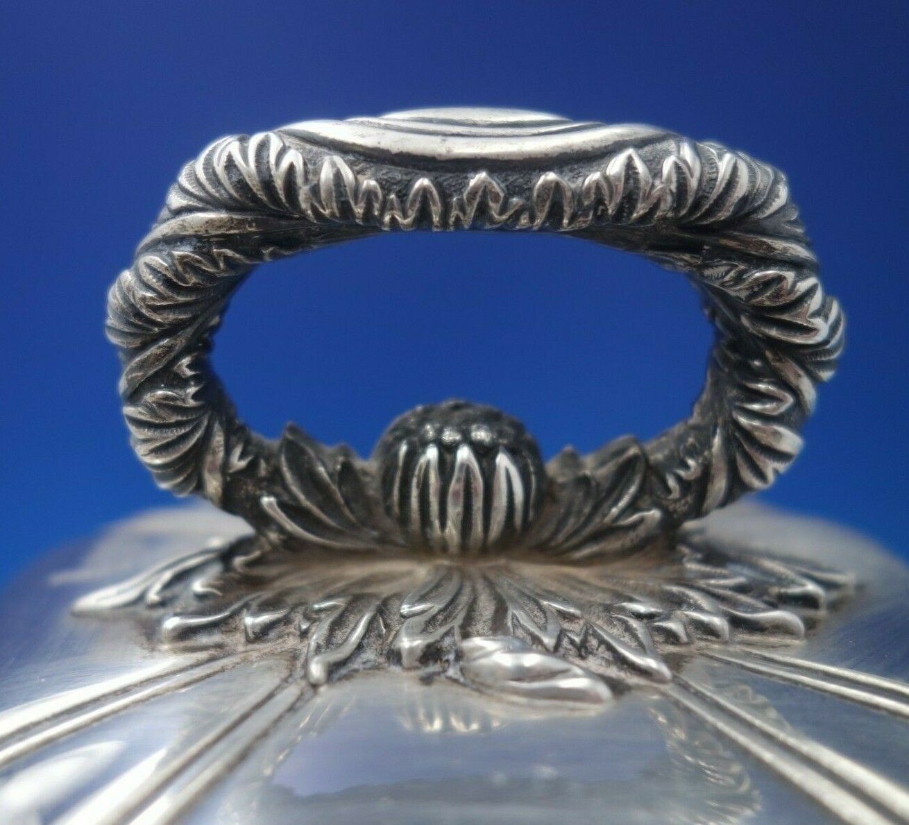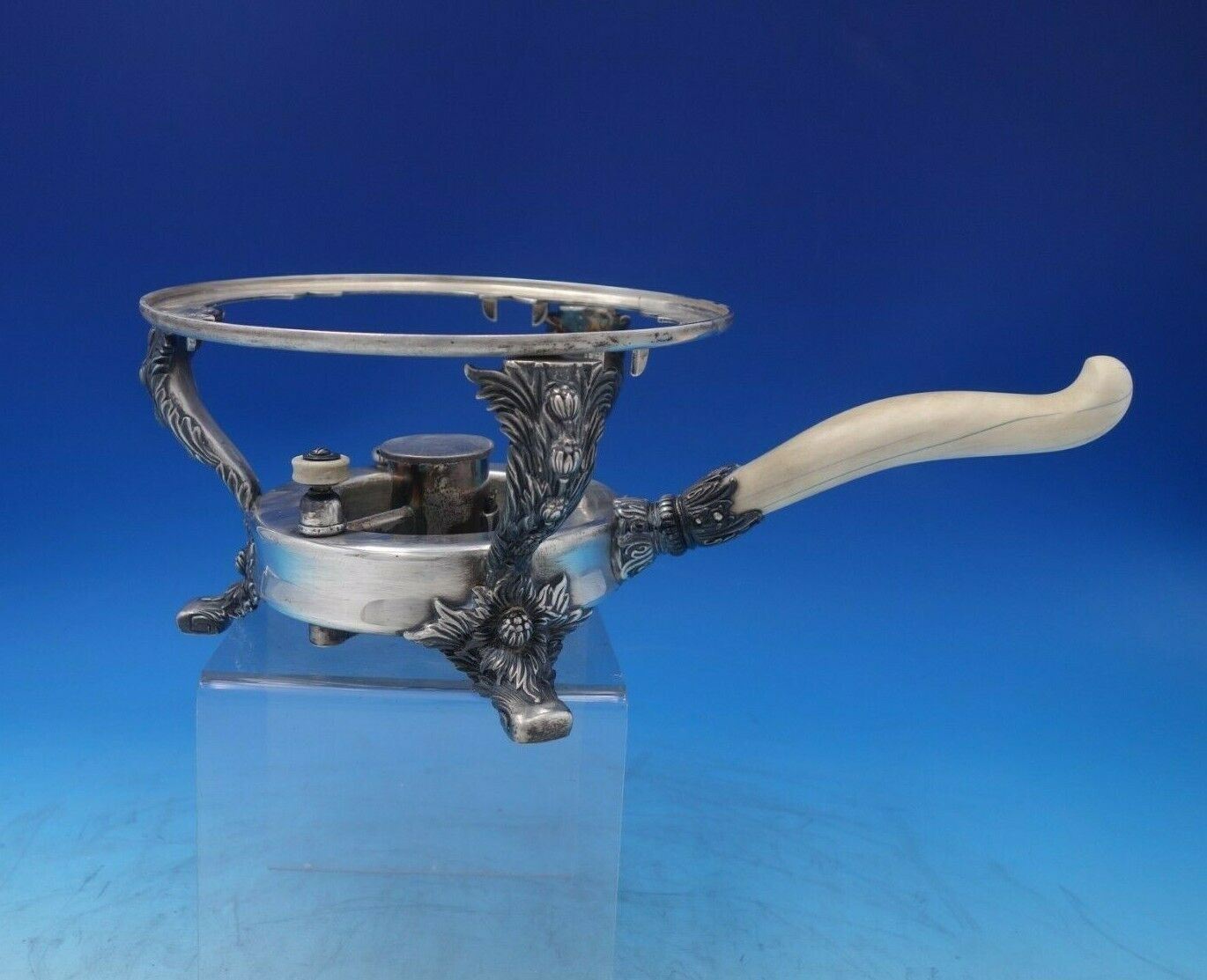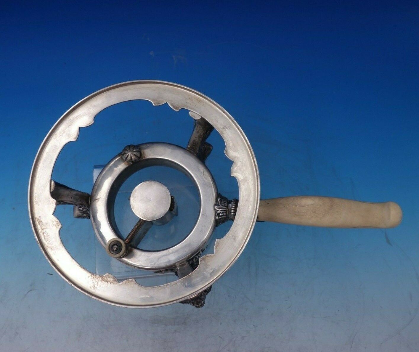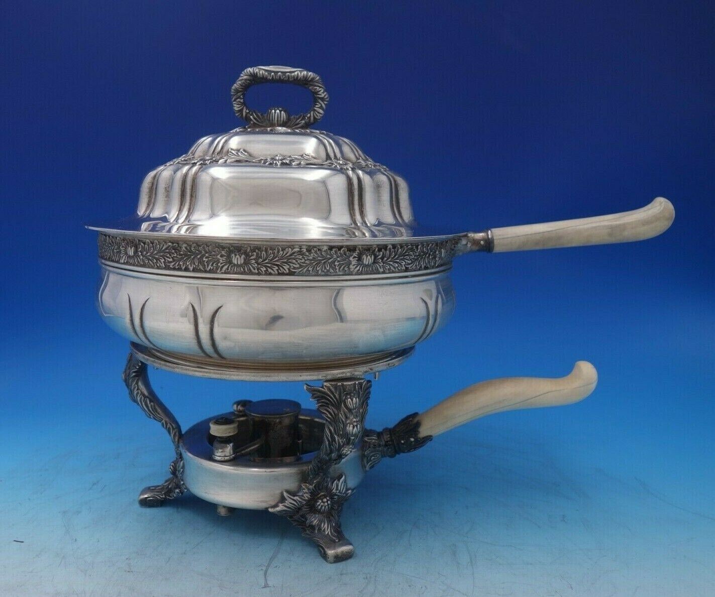Gorgeous Chrysanthemum by Tiffany and Co sterling silver chafing dish with warmer and faux ivory handles, circa 1890. This piece measures 12" x 10" (without handle) and weighs 101.4 troy ounces. It is not monogrammed and is in good vintage condition as shown in the photos. Absolutely beautiful!