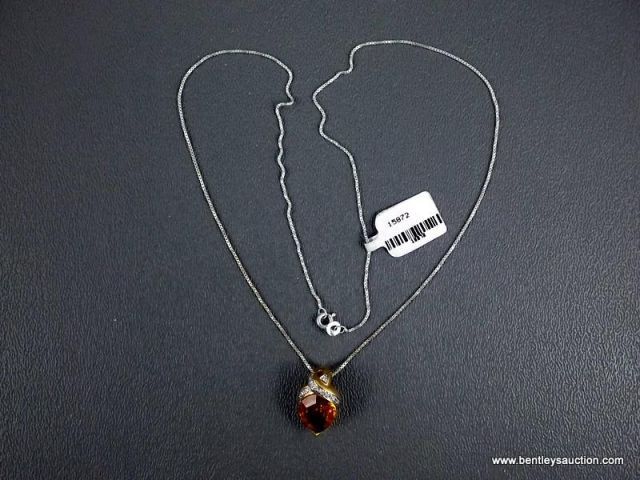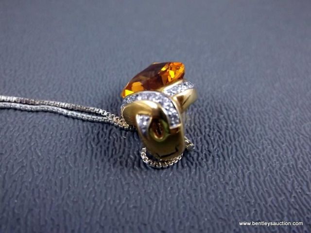 Sterling Silver Chain w/ 18K Yellow Gold Pendant w/ Amber Gem and Diamonds-Marked CS Weight: 7.6 Gra
