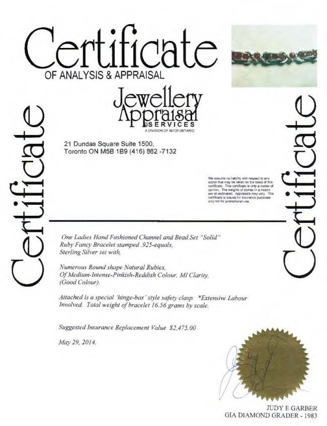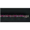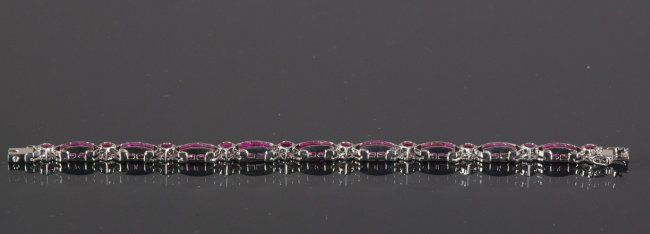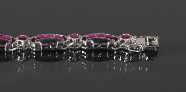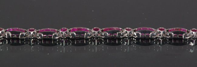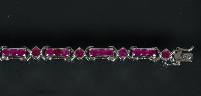 One ladies hand fashioned channel and bead set 'solid' ruby fancy bracelet, stamped .925-equals sterling silver set with numerous round shape natural rubies; suggested insurance replacement value: $2,475; accompanied with Certificate; D: 6.5 cm, 16.56 grams