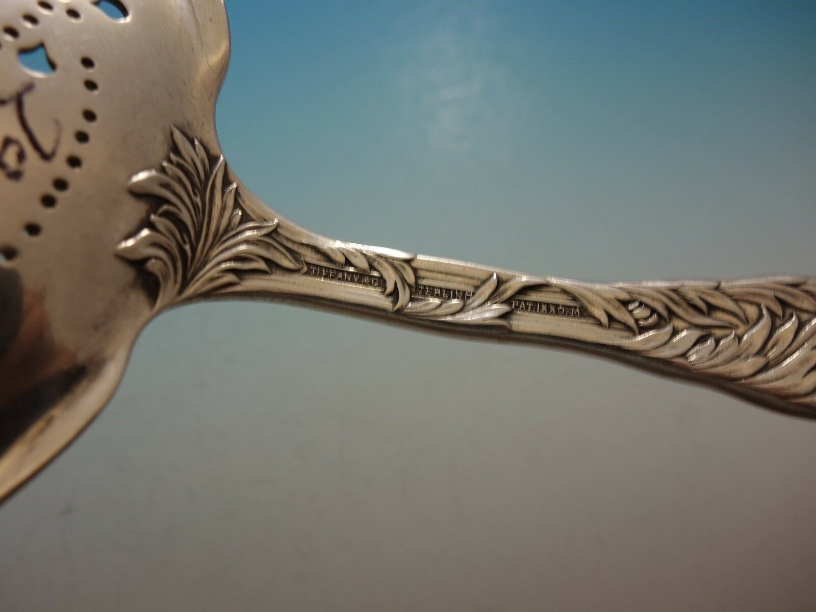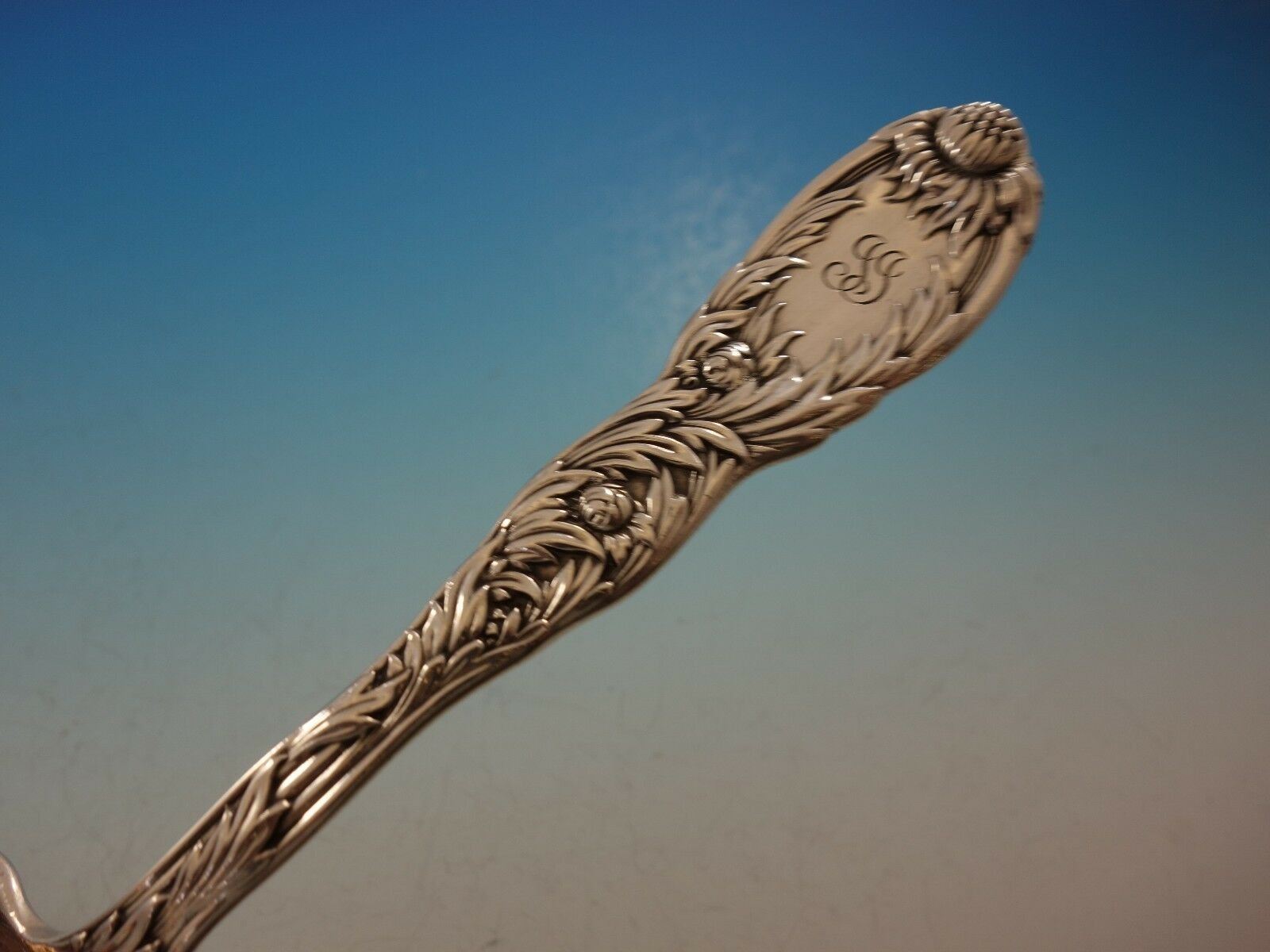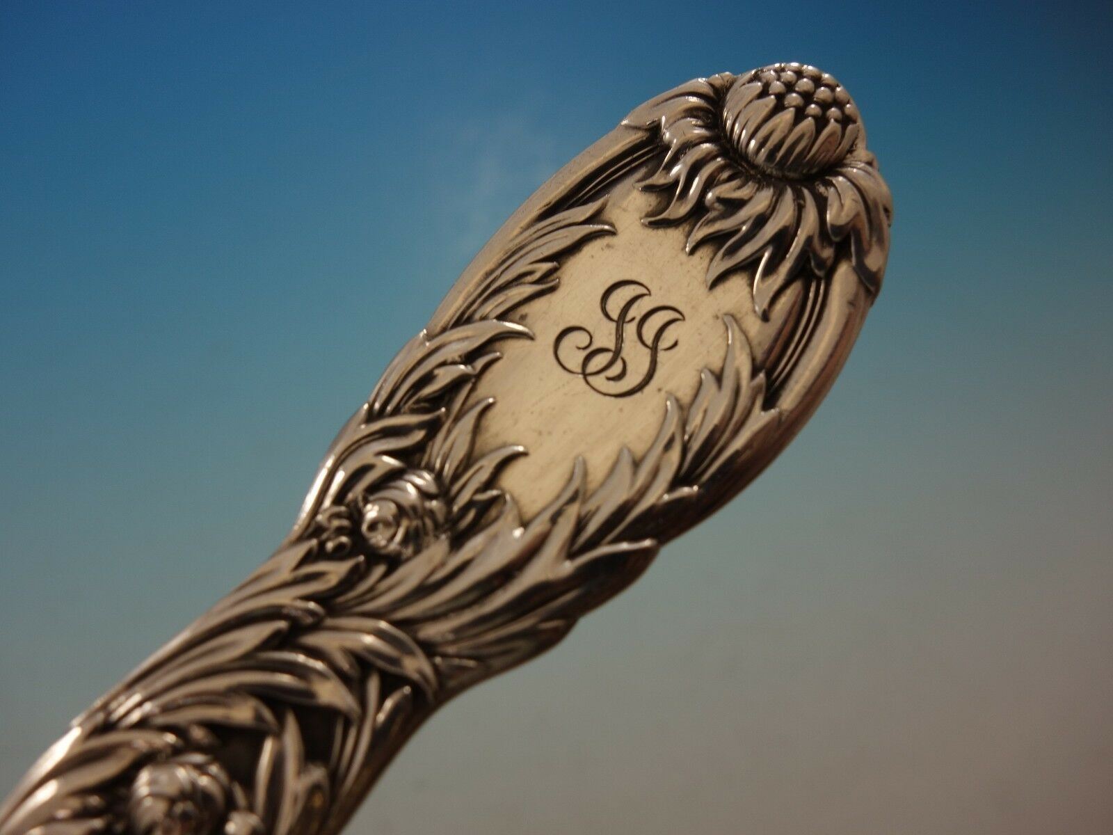 Sterling silver Saratoga Chip Server 8 7/8" in the pattern Chrysanthemum by Tiffany. The server is monogrammed "JJ" (see photo) and is in excellent condition.