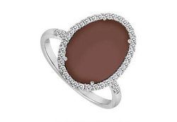 A beautifully prong-set large oval shape chocolate chalcedony in the center & is surrounded by brilliant-cut round diamonds. Other smaller diamonds adorn both sides. This perfect design ring is made in rhodium .925 sterling silver & has a total gem weight (TGW) of 16.00 carats.
