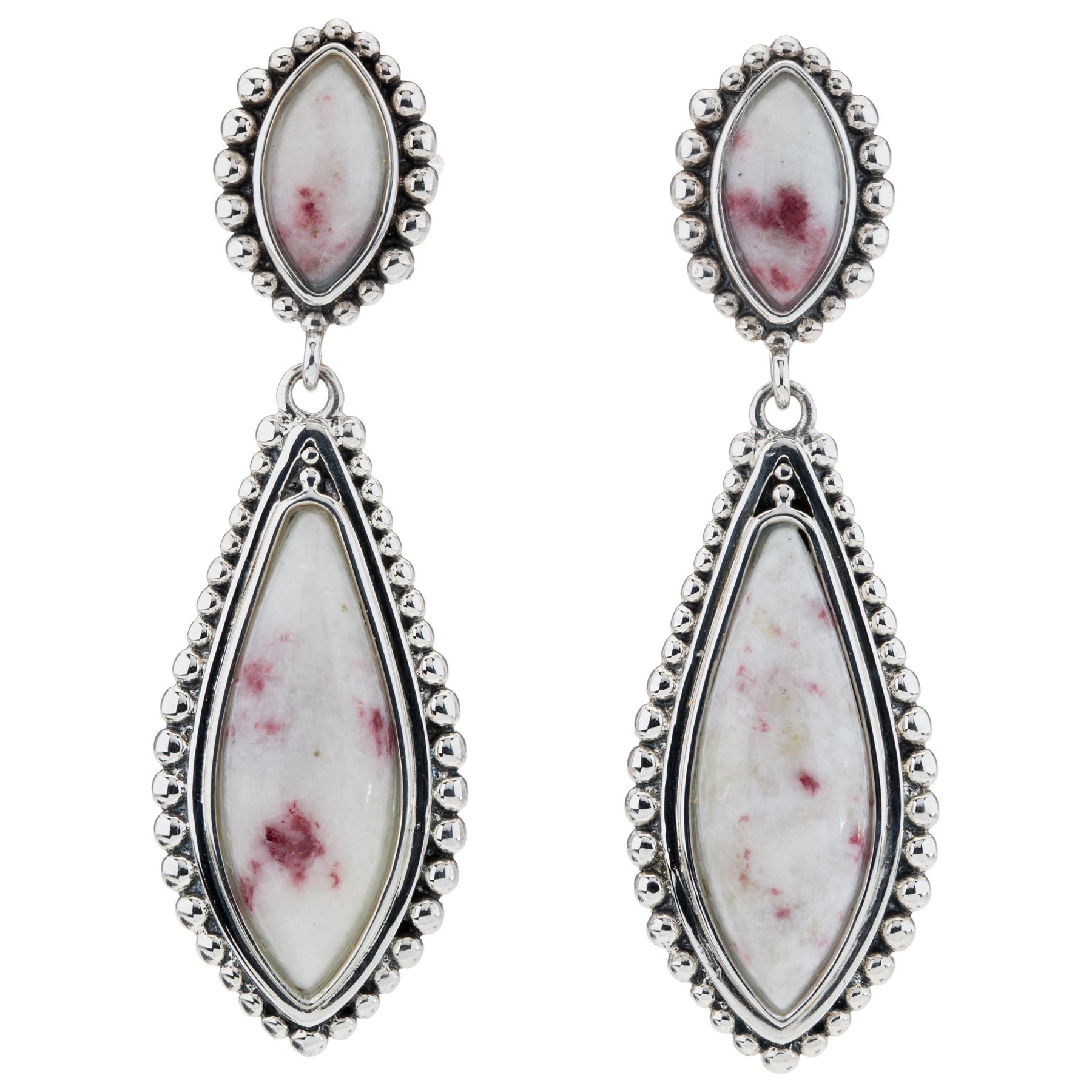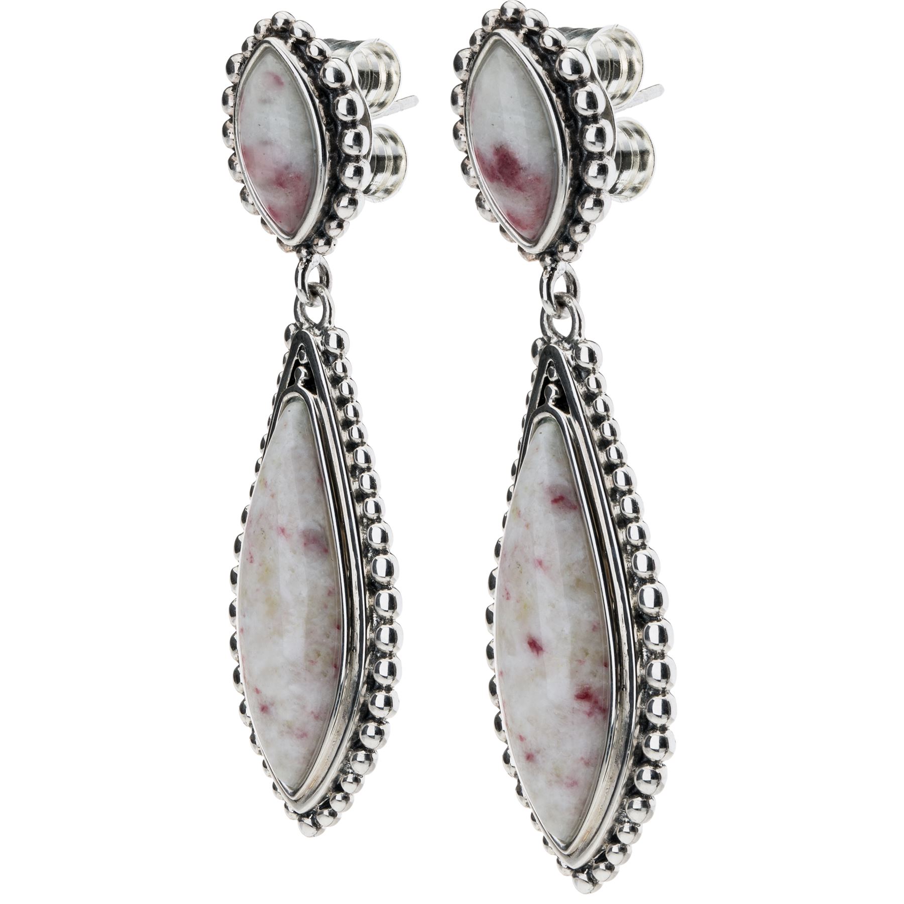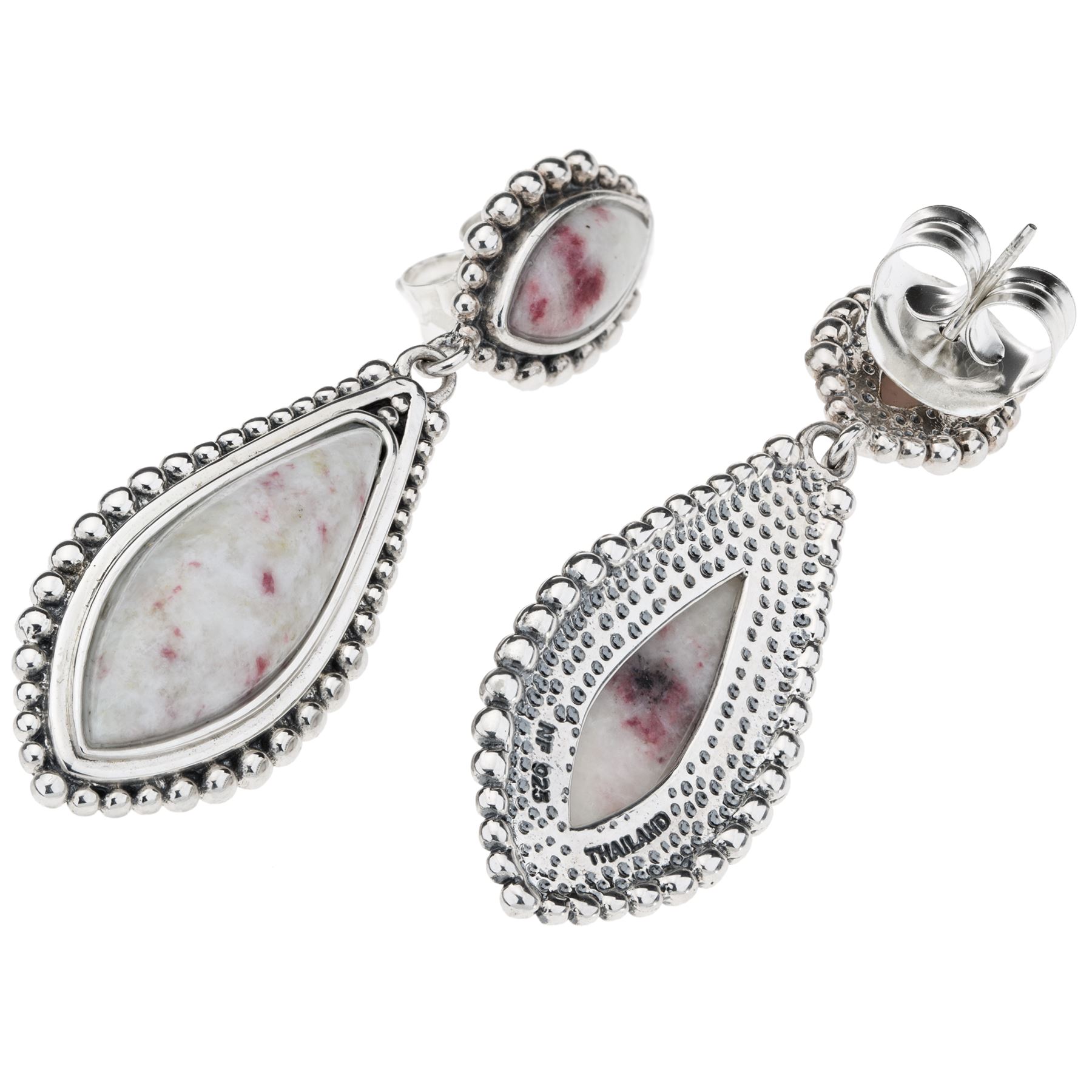 Each finely crafted sterling silver earring features one freeform shaped Cinnabar gemstone cabochon on the dangling drop and one matching marquise shaped gemstone cabochon on the post. Oxidized accented beadwork surrounds each stone while the jumbo butterfly backs quickly side into place.