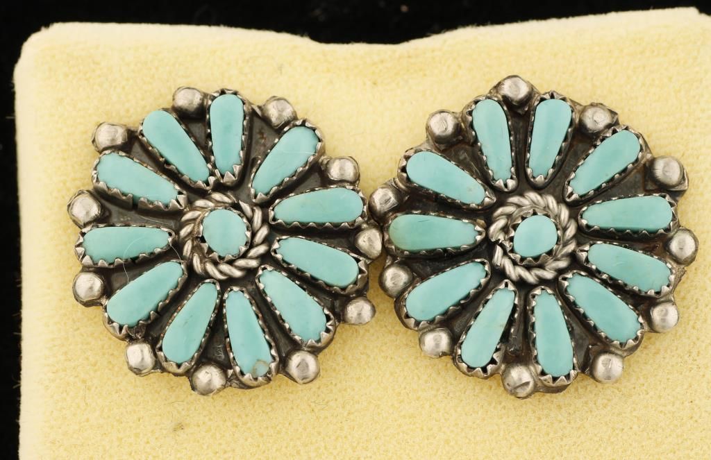 Artistic turquoise earrings are a great example of cluster work. Cluster work has a number of stones set in bezels close together. In this case, the turquoise stones are set to create a floral design. The earrings are marked "B" and "Sterling" and have post backs. They are a little over 1" in diameter.