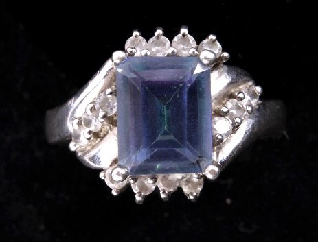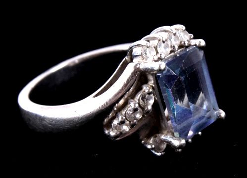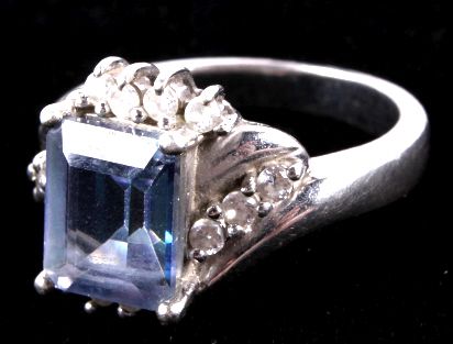 This lot features a sterling silver cocktail ring. The ring is marked 925 and has an aquamarine gemstone. The ring is size 8.