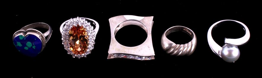 This is a collection of 5 sterling silver cocktail rings. Each of the rings is marked "Sterling" or "925". 4 of the rings have a center stone. The rings range in size from 4-8. All the rings are in good condition.