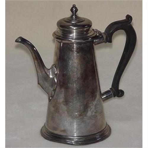 Sterling silver coffee pot of good weight, 8 3/4'' tall x 4 1/2'' in diameter at base, wood handle. Signed Grogan Company- Pittsburgh PA. Candition is good, there is a dent on the base as seen in photo, otherwise the piece is in very nice shape. A good polishing will do wonders. (2)