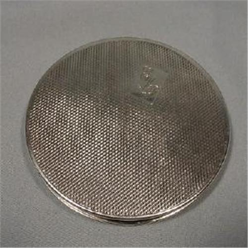 A vintage sterling silver compact, hallmarked for Birmingham (England) 1944. It has engine turned pattern front and back in a diamond-shaped grid. On the front  is a plain panel with the initials  ?E.L.F.? engraved in script.  Inside is plain with mirrored lid - the mirror is cracked in half, but would be easily replaced. It is not glued, but held in place by a pressure ring. Compact measures 7cm (2.3/4 inches) diameter.  It is in basically good condition externally, but has a few shallow dents and a scratch to the rear.  Clasp needs rejigging, its too loose at present. A very attractive display piece though.