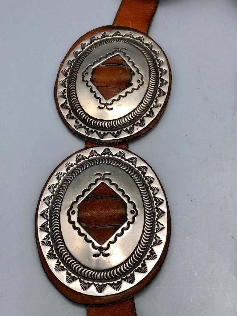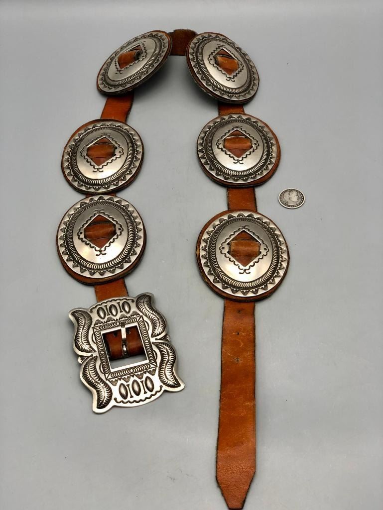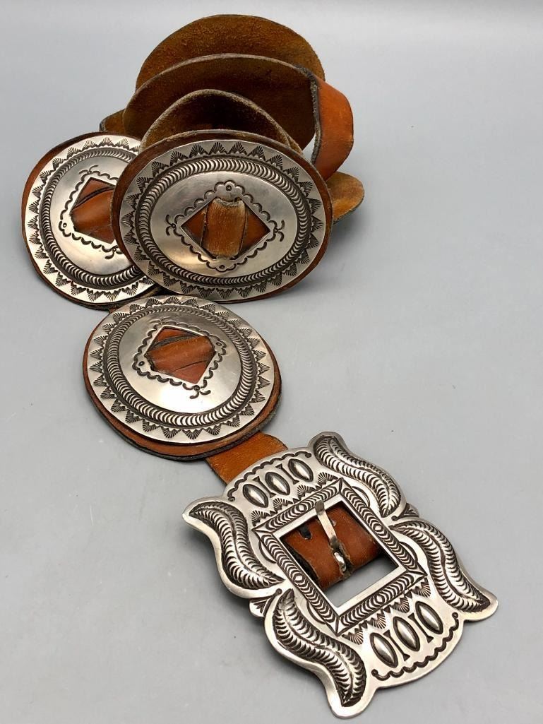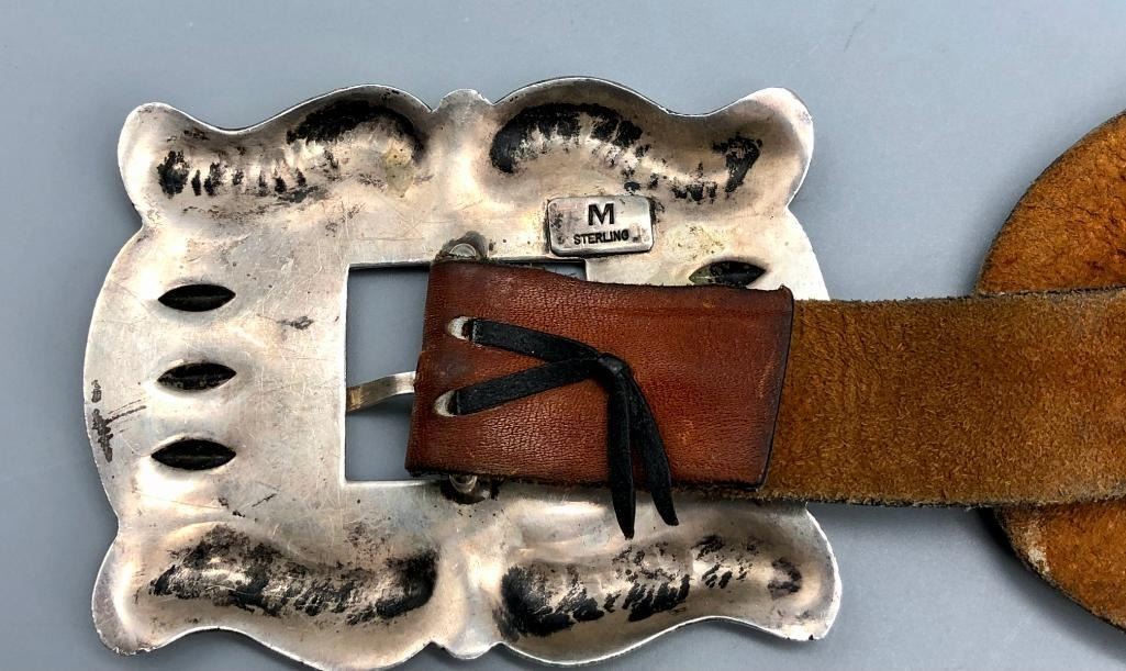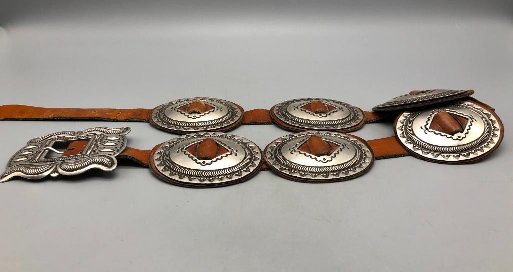 Presented for sale in this lot is a sterling silver concho belt. This is a gorgeous concho belt with large conchos that have leather backings. The buckle has great repousse work and both have hand stamped designs. It is on a nice supple leather brown leather belt. It is stamped as sterling. MAKER: Hallmarked M on a plate. APPROX AGE: Vintage. SIZE: Overall length is 36-1/4 inches long X 1 inch wide. Conchos are 3-7/8 inches wide X 3-1/4 inches tall. Buckle is 3-7/8 inches wide X 2-7/8 inches tall. Weighs 570.9 grams. CONDITION: Good for its age, normal wear expected. Please look closely at the pictures as they are an important part of our description and are hereby incorporated into the description, specifically with regards to condition. SHIPPING: There will be a $5 handling / packaging fee for shipping this lot. The actual cost of postage will be added on top of that. BUY IT NOW: If you would like to buy this item now, without waiting for the auction day to bid on it, we do offer this option (which is available up to 48 hours before the actual auction starts). The “Buy it Now†price is the high estimate of this lot (plus applicable fees and the Buyer's premium is discounted to 10% when using the Buy it Now option). If you would like to exercise this option, you must contact us by email (or phone as long as you talk to someone live). Reference this lot number and your intention to "Buy it Now."