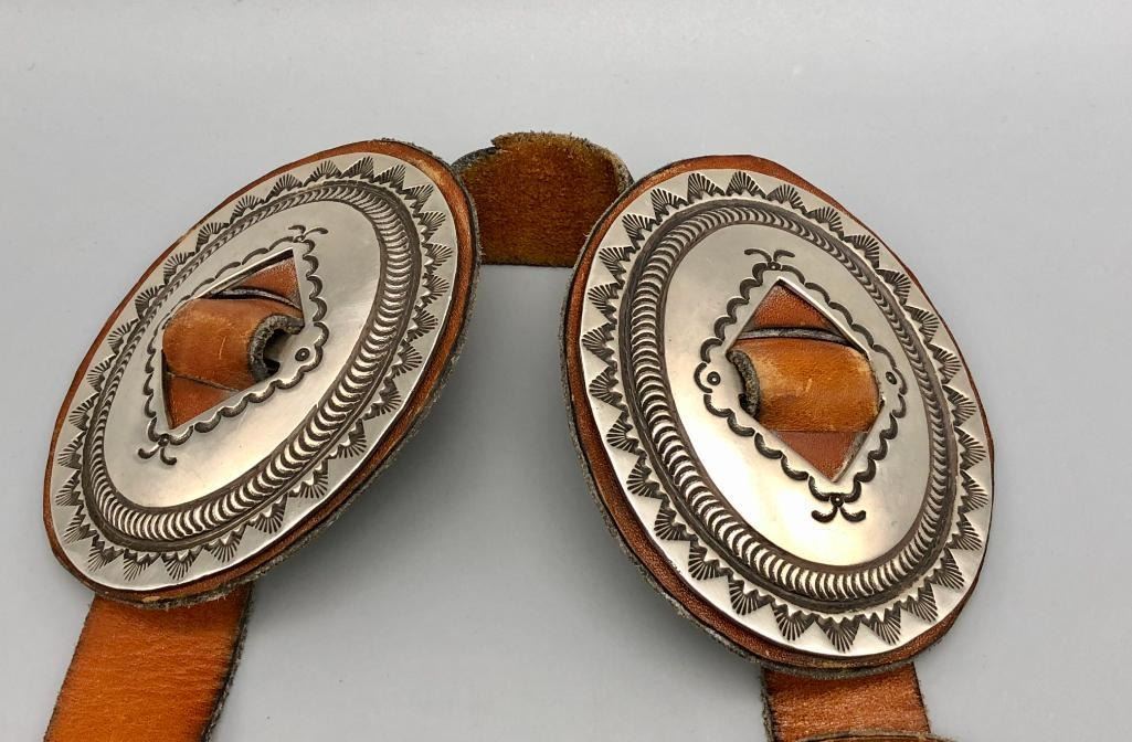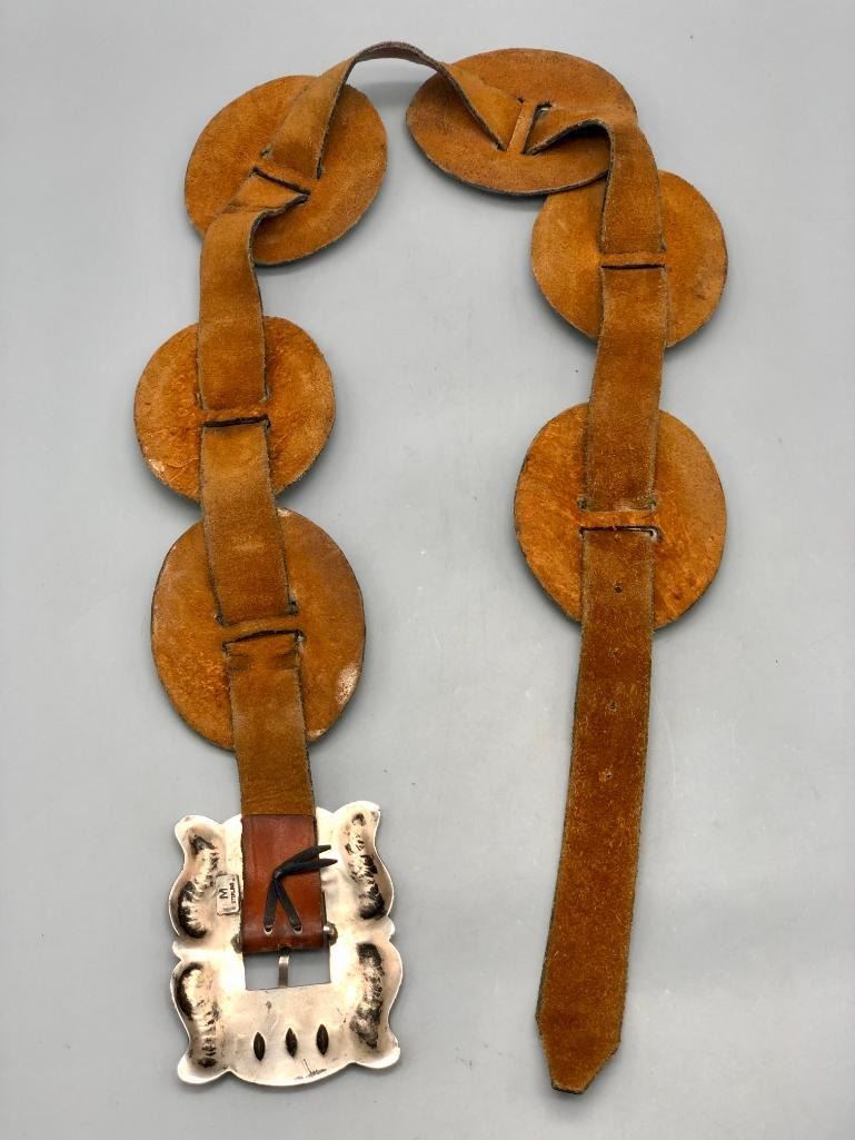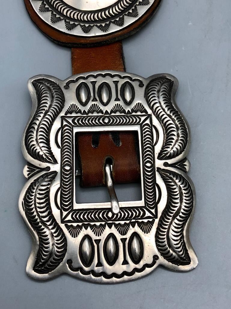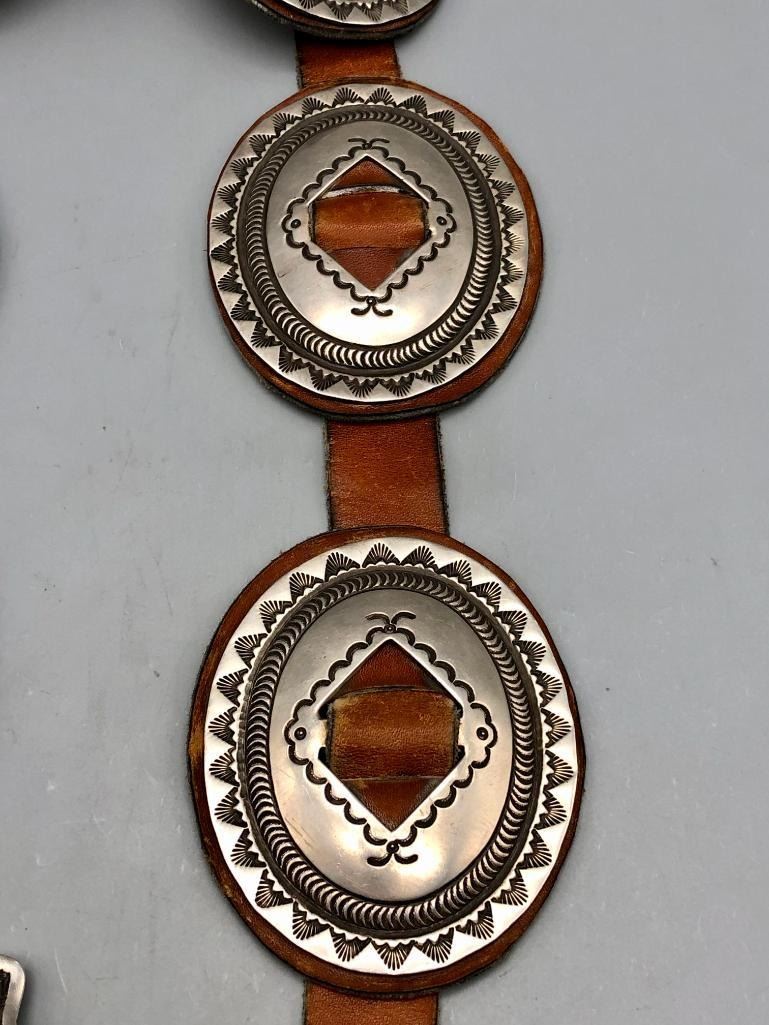 Presented for sale in this lot is a sterling silver concho belt. This is a gorgeous concho belt with large conchos that have leather backings. The buckle has great repousse work and both have hand stamped designs. It is on a nice supple leather brown leather belt. It is stamped as sterling. MAKER: Hallmarked M on a plate. APPROX AGE: Vintage. SIZE: Overall length is 36-1/4 inches long X 1 inch wide. Conchos are 3-7/8 inches wide X 3-1/4 inches tall. Buckle is 3-7/8 inches wide X 2-7/8 inches tall. Weighs 570.9 grams. CONDITION: Good for its age, normal wear expected. Please look closely at the pictures as they are an important part of our description and are hereby incorporated into the description, specifically with regards to condition. SHIPPING: There will be a $5 handling / packaging fee for shipping this lot. The actual cost of postage will be added on top of that. BUY IT NOW: If you would like to buy this item now, without waiting for the auction day to bid on it, we do offer this option (which is available up to 48 hours before the actual auction starts). The “Buy it Now†price is the high estimate of this lot (plus applicable fees and the Buyer's premium is discounted to 10% when using the Buy it Now option). If you would like to exercise this option, you must contact us by email (or phone as long as you talk to someone live). Reference this lot number and your intention to "Buy it Now."