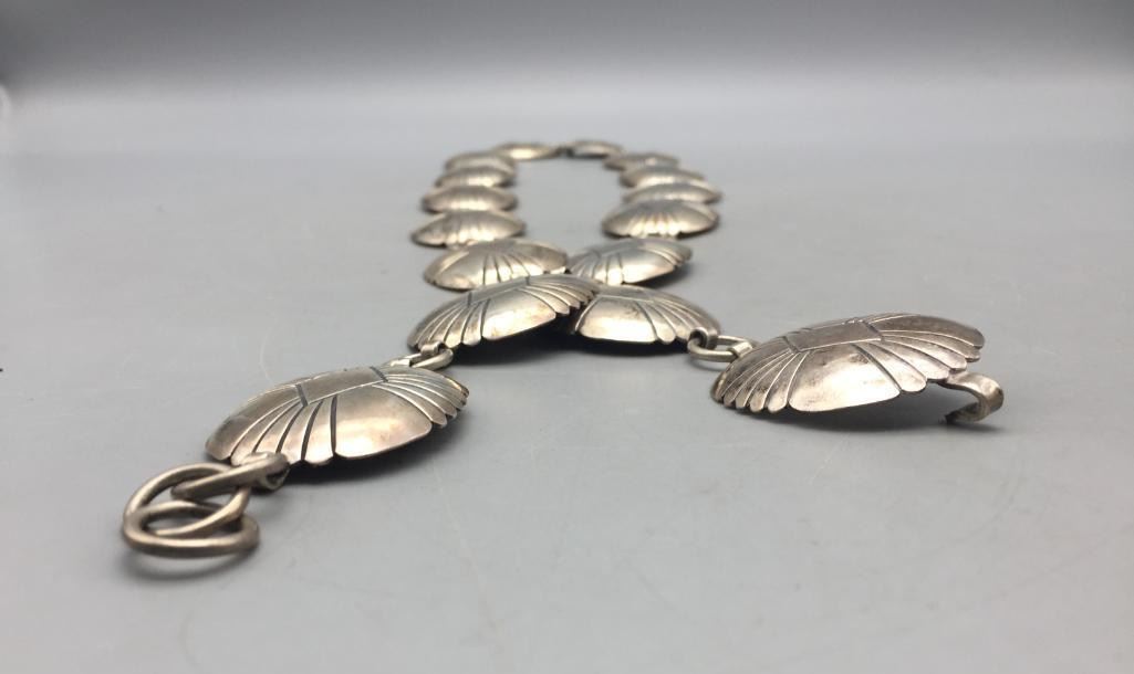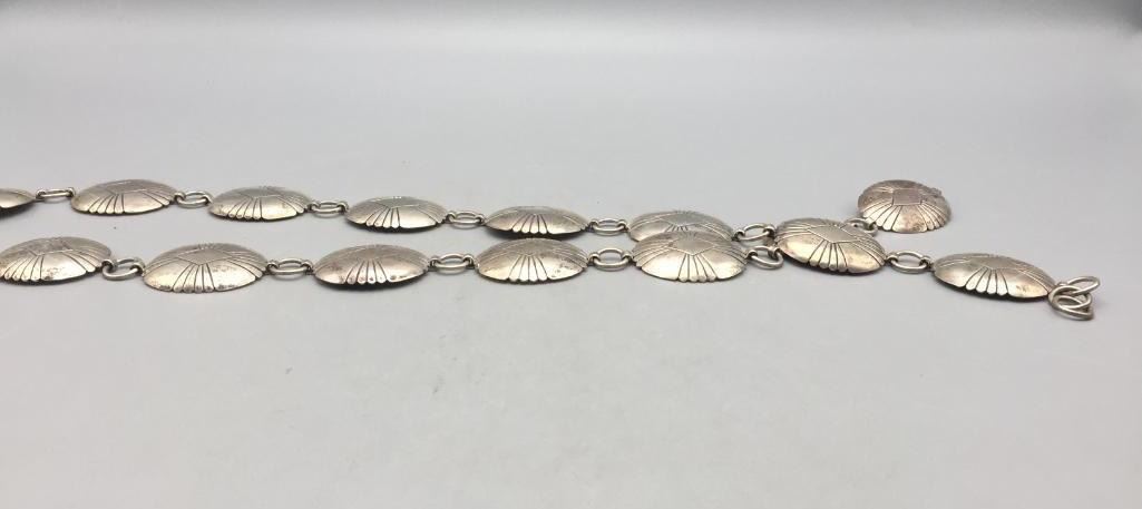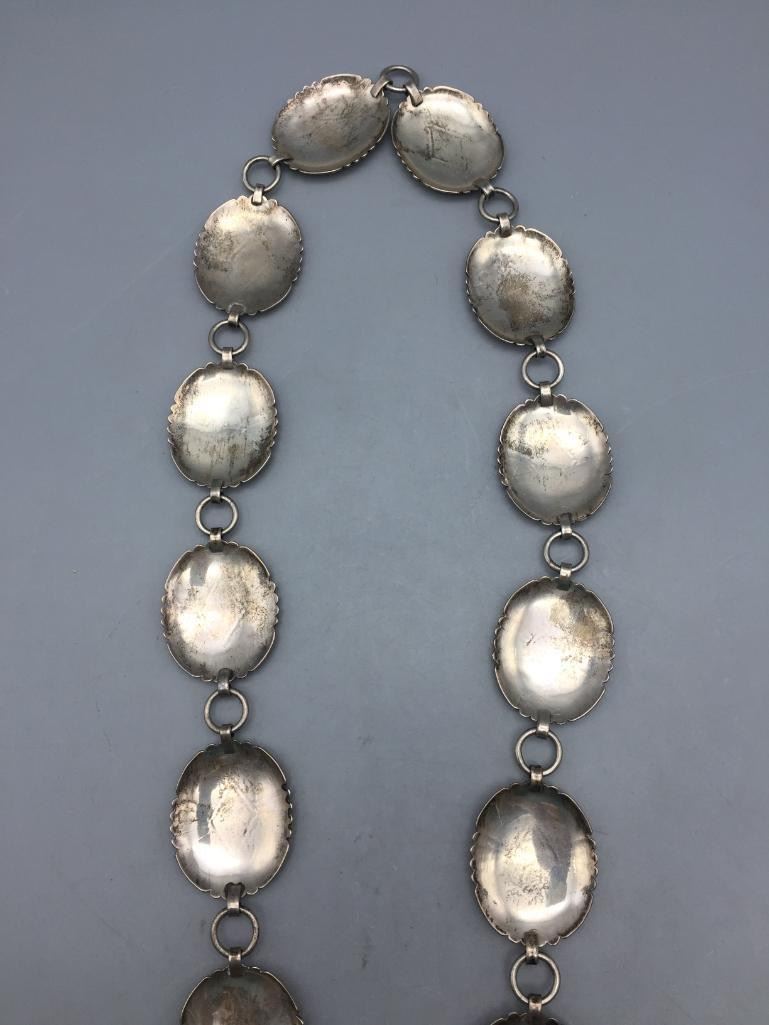 Description: Presented for sale in this lot is a sterling silver concho belt. It is a link style. Stamped as sterling. Maker: Hallmarked GT. Approx. Age: Vintage. Size: 38 inches long X 1-1/2 inches wide. Weighs 203.4 grams. Condition: Good for its age, normal wear expected. Please look closely at the pictures - they are an important part of our description. Shipping: There will be a $5 handling / packaging fee for shipping this lot. The actual cost of postage will be added on top of that.