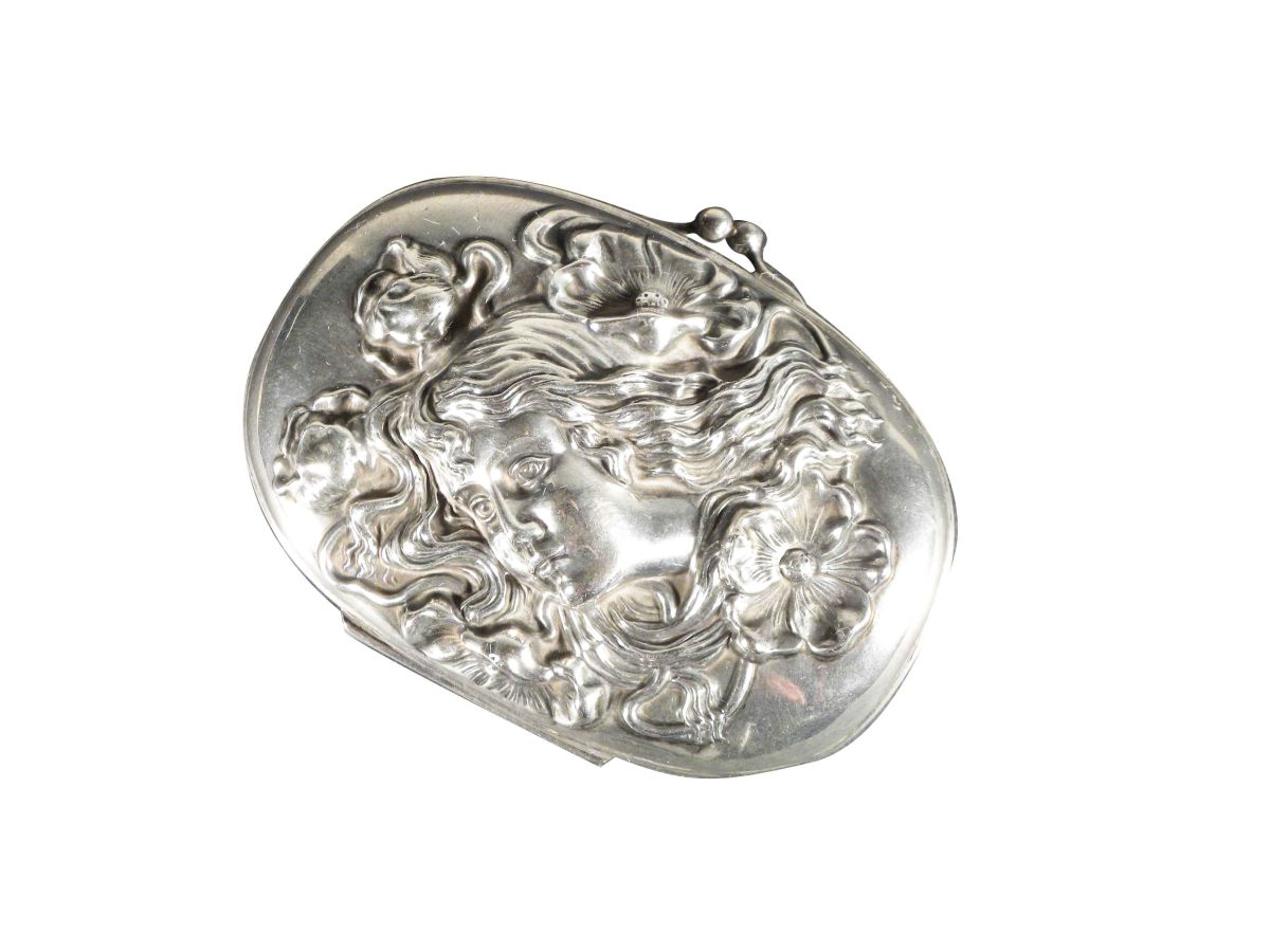 Sterling Silver Covered Soap Dish. Extremely high relief, woman with flowers. Excellent condition. 3 X 4 inches.