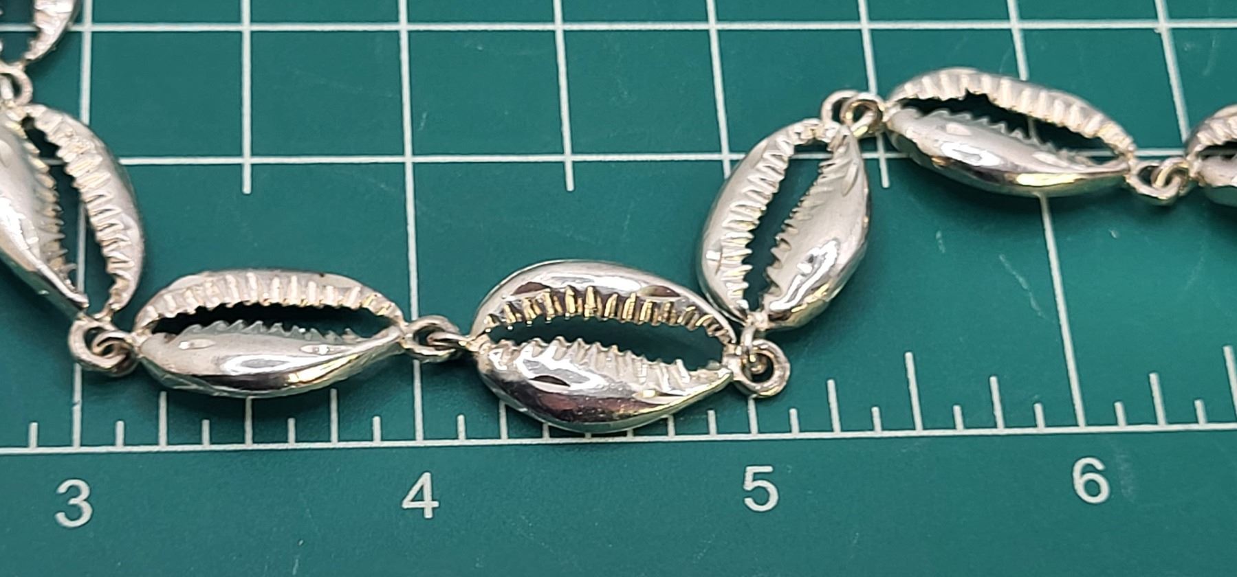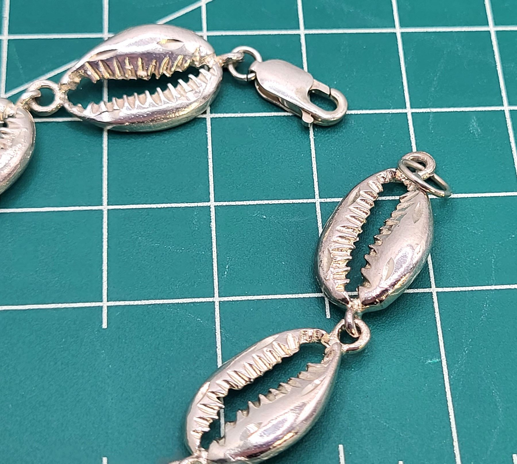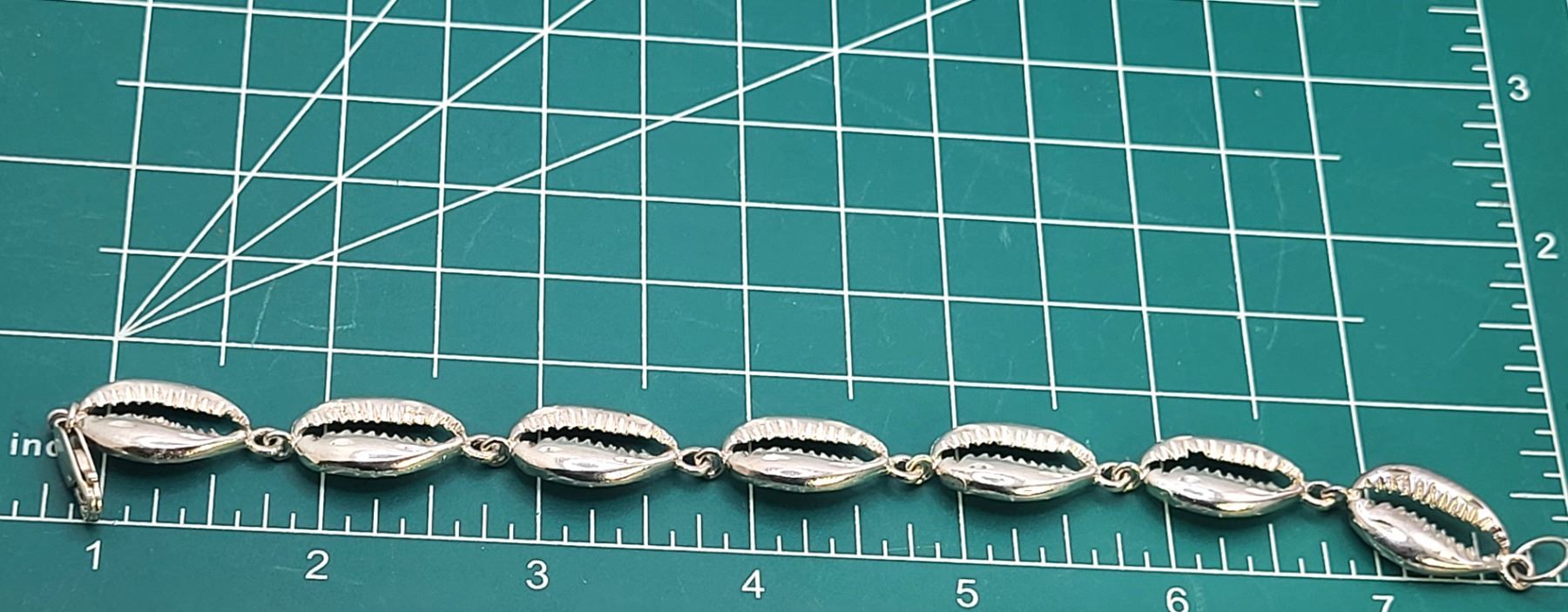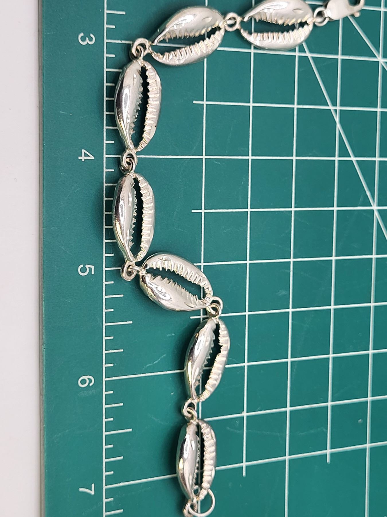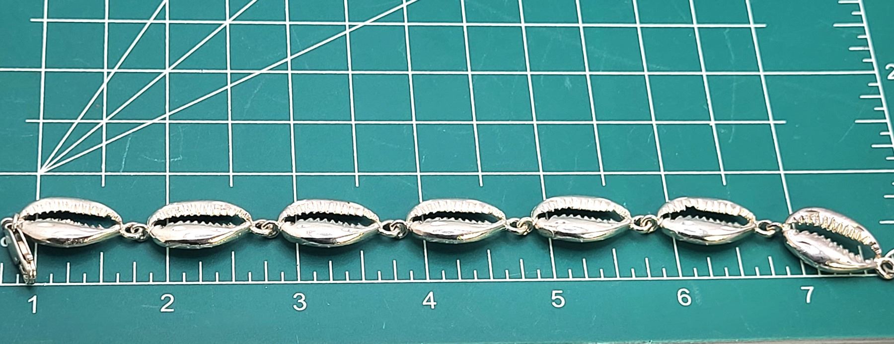 This is a sterling silver bracelet with & quot;Cowrie Shell& quot; links that span 8& quot; and end with a lobster clasp.& nbsp; The bracelet is approximately 12mm wide. This bracelet is suitable for wear by either gender.& nbsp; Admin: 33121/10