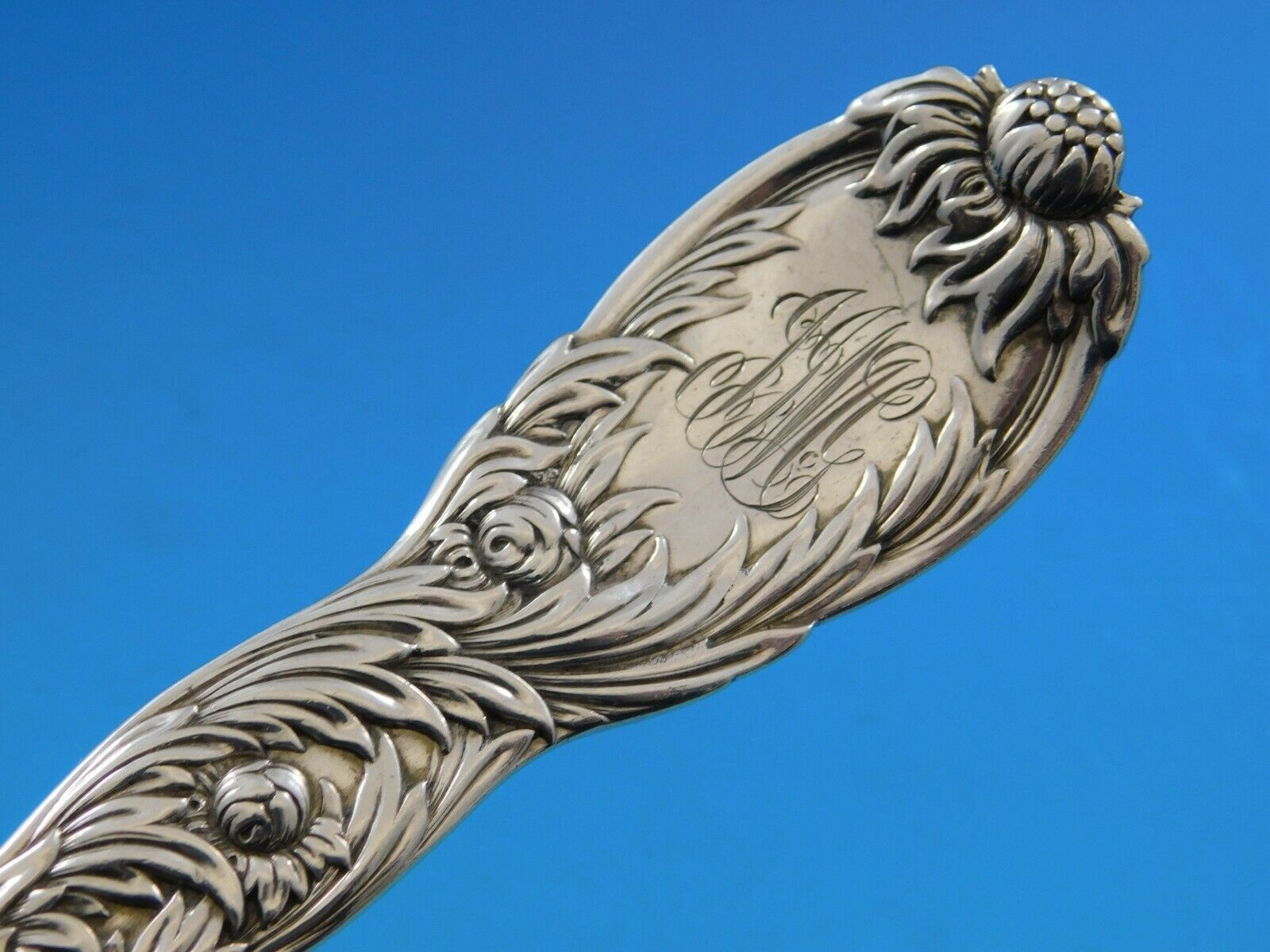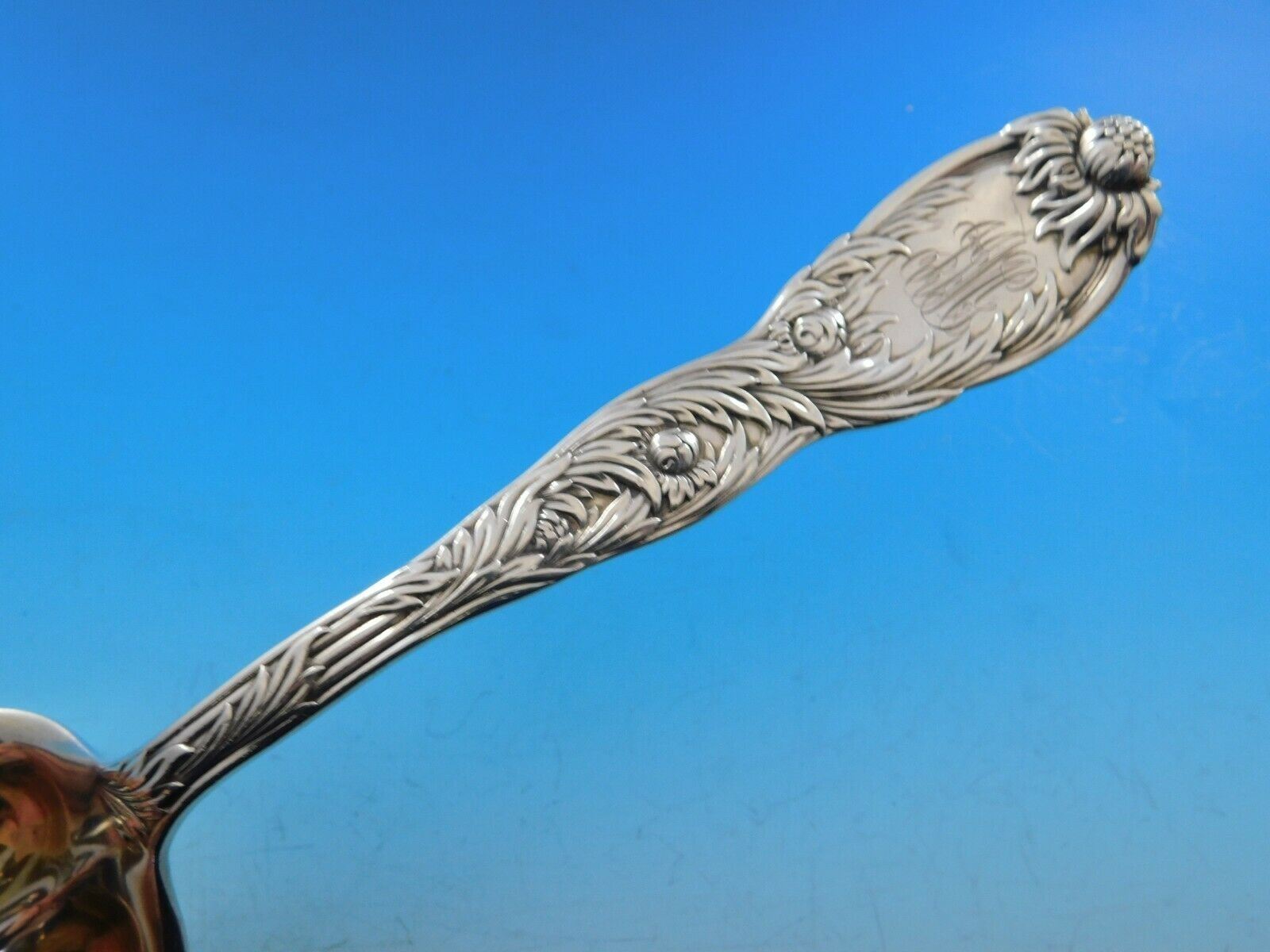 Chrysanthemum (c1880) Tiffany's luxurious Chrysanthemum silver was designed in 1880 by Charles Grosjean. With its flowing curves, swirling vegetation, meandering tendrils, and exotic blossoming flowers, Chrysanthemum is characteristic of The Tiffany Style or Art Nouveau, as the naturalistic style is now commonly known. The rich and graceful flowering motifs of Chrysanthemum were undoubtedly influenced by founder Louis Comfort Tiffany. They make Chrysanthemum the most sumptuous of any American pattern. Beautiful sterling silver Cracker Scoop 8 3/8" in the pattern Chrysanthemum by Tiffany. It is monogrammed (see photo) and is in excellent condition.