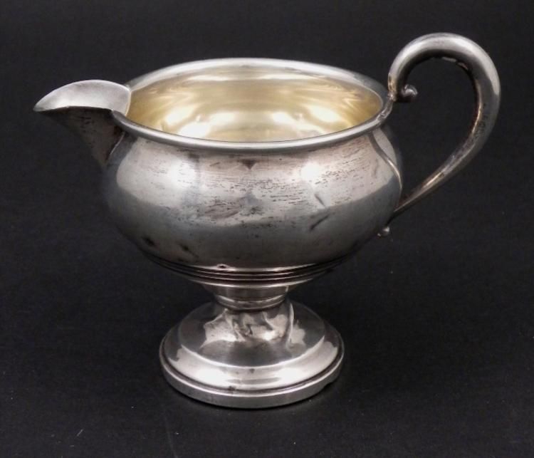 This sterling silver creamer has a graceful handle and large spout. The base is reinforced with cement. The underside has the number 3258, and possibly the maker above, although it is obscured. It stands 4" tall and 5 1/4" from handle to spout. It is in fair to good condition, with dents and dings. * This is a nice silver creamer for any collector.