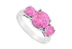 A bigger round created pink sapphire is accented by two smaller created pink sapphires on the sides. Made in .925 sterling silver rhodium this three stone ring has a total weight (TGW) of 2.50 carats.