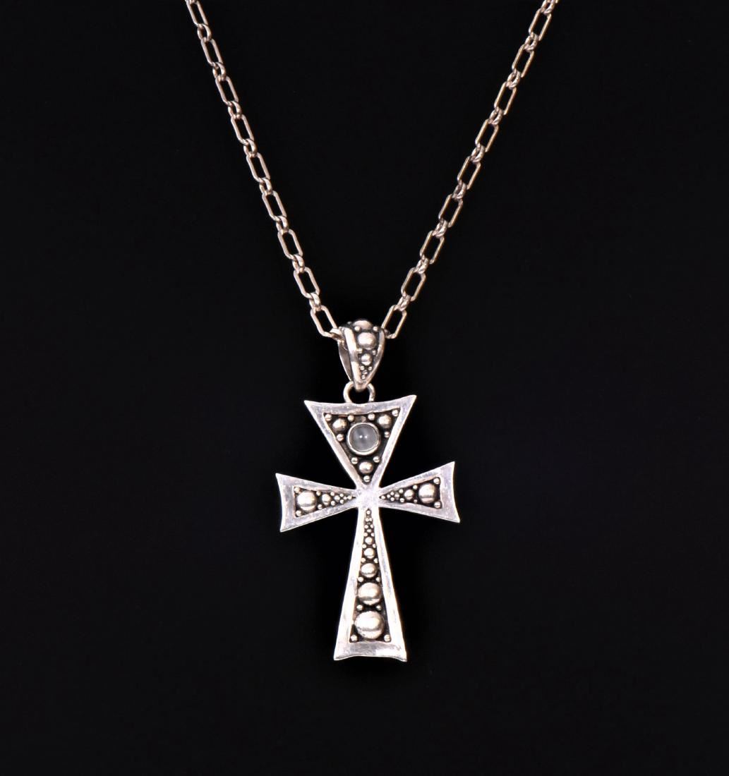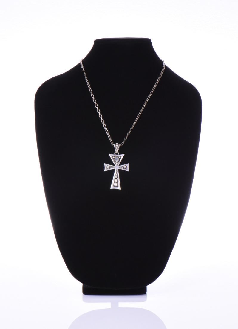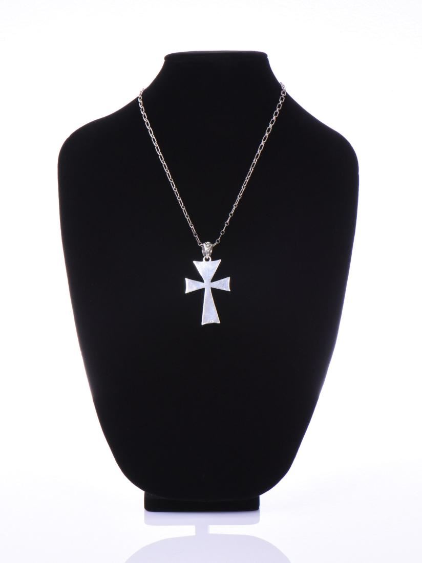 Sterling Silver Cross Pendant And Chain. Stamped 925 BA. Base Stand Not Included. Estimated less than 50 yrs old. 925 Sterling Silver consisting of 92.5% silver and 7.5% copper. Tested Positive using Nitric Acid Chemical Scratch Test, Cloth Rub Test, Smell Test, and Magnet Test. Markings of 925 or Sterling stamp. The reason silver needs to be combined with other metals is that it is very difficult to make great designs with just pure silver, which is very soft and malleable. A bit of hardness has to be introduced by adding other metals such as copper. That is why jewelers are capable of making the most intricate an complex designs with 925 Sterling Silver. Silver is one of the most valuable elements next to gold. Mexico is the leading producer of sliver, followed by the United States, Canada, Australia, Spain, Peru, and Russia. Many countries do not require their precious metal items to be stamped and therefore we test to ensure we accurately represent the product. Size: See Ruler Photo. (Photos Represent The Condition Of The Lot.)
