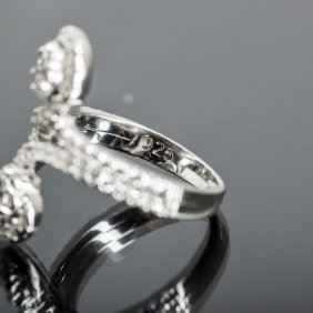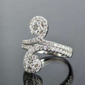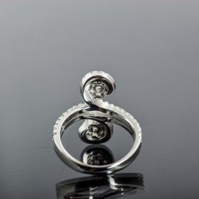 A sterling silver bypass ring featuring two rows of cubic zirconia, each ending in a spiral design. Marked 925 to the interior of the band. Size 8. This item is accompanied with a certificate of authenticity.