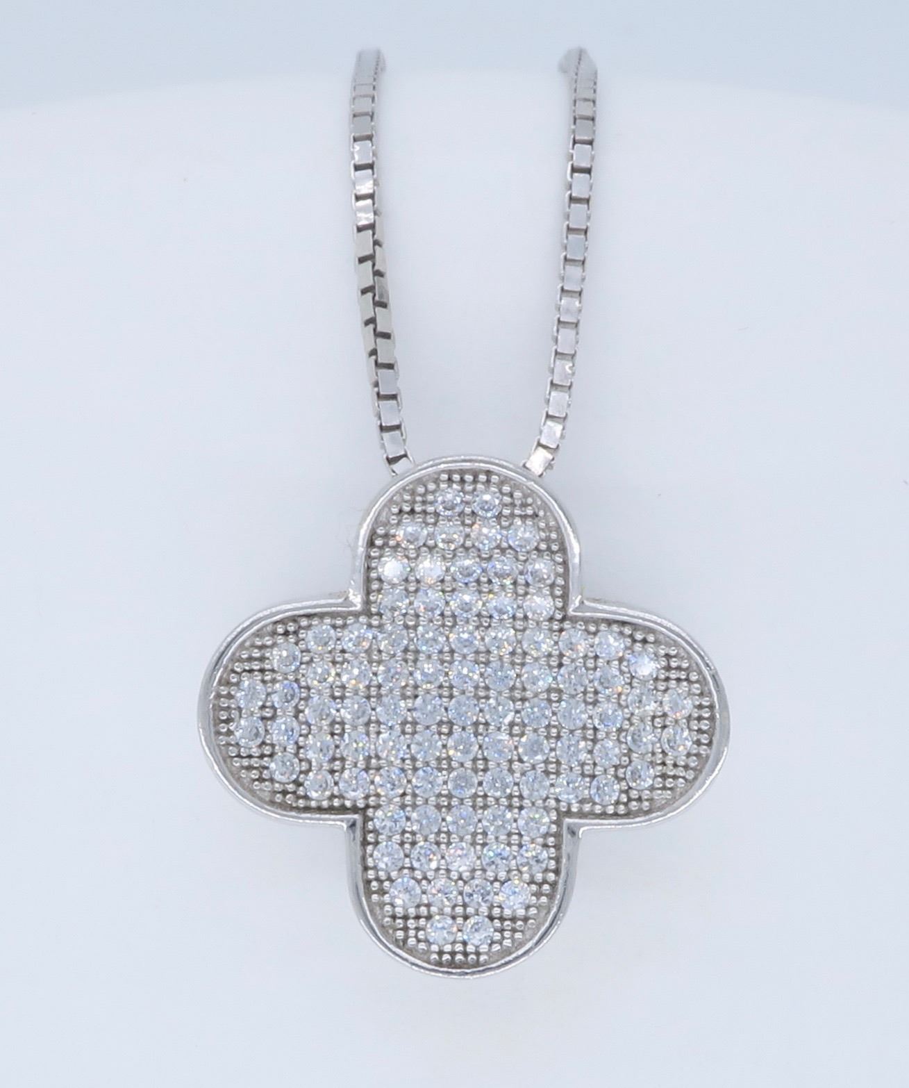 One Sterling Silver Cubic Zirconia Pendant with Chain. Total weight of this pendant with chain is 5.2 grams. Total length of this chain is 18 inches.