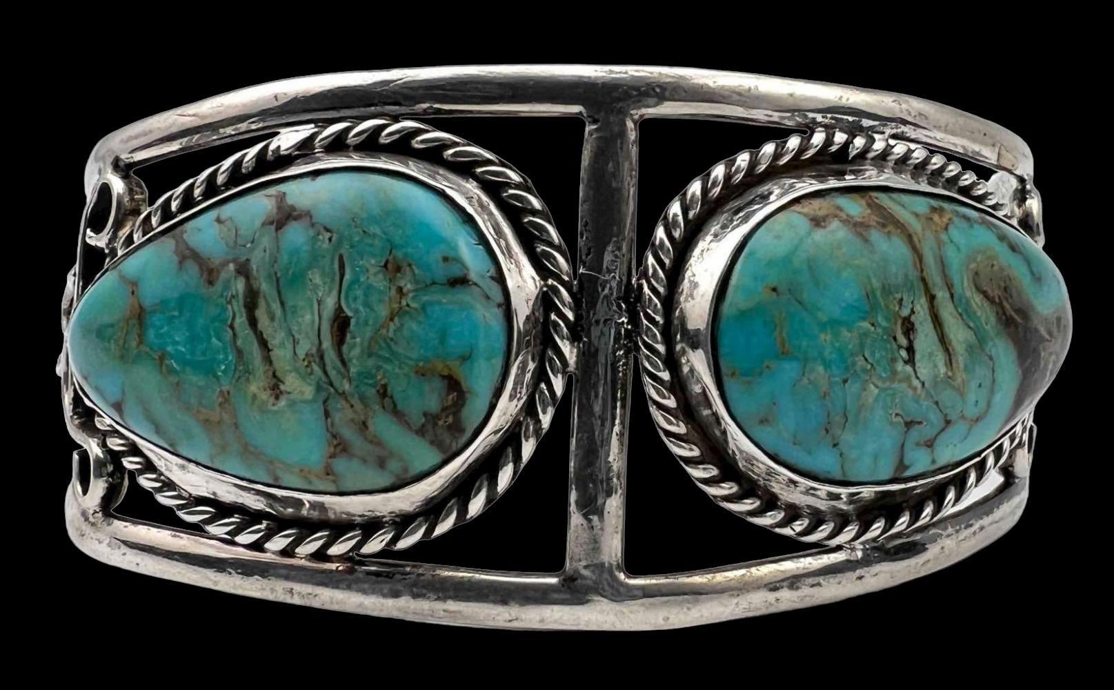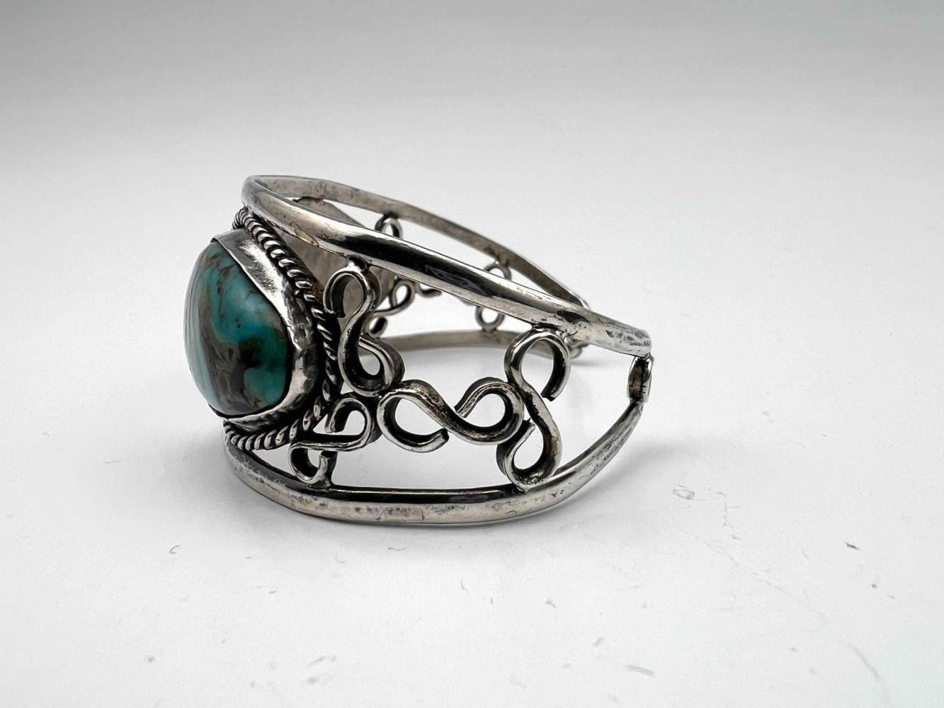 Native American Sterling Silver Cuff Bracelet With Phenomenal Tear Drop Turquoise.42.1g. Unmarked, Tests Silver. Approximately 6.25in. Inner Cuff, 1.5in. Cuff Break, 3.0625in. Width.