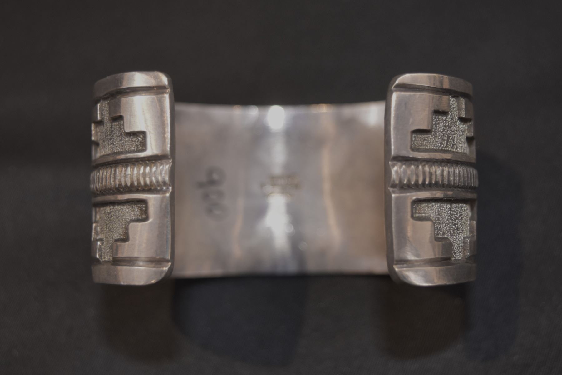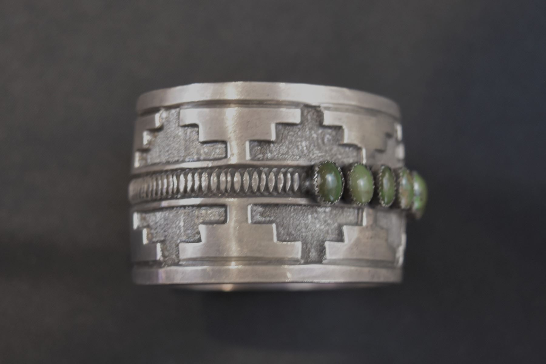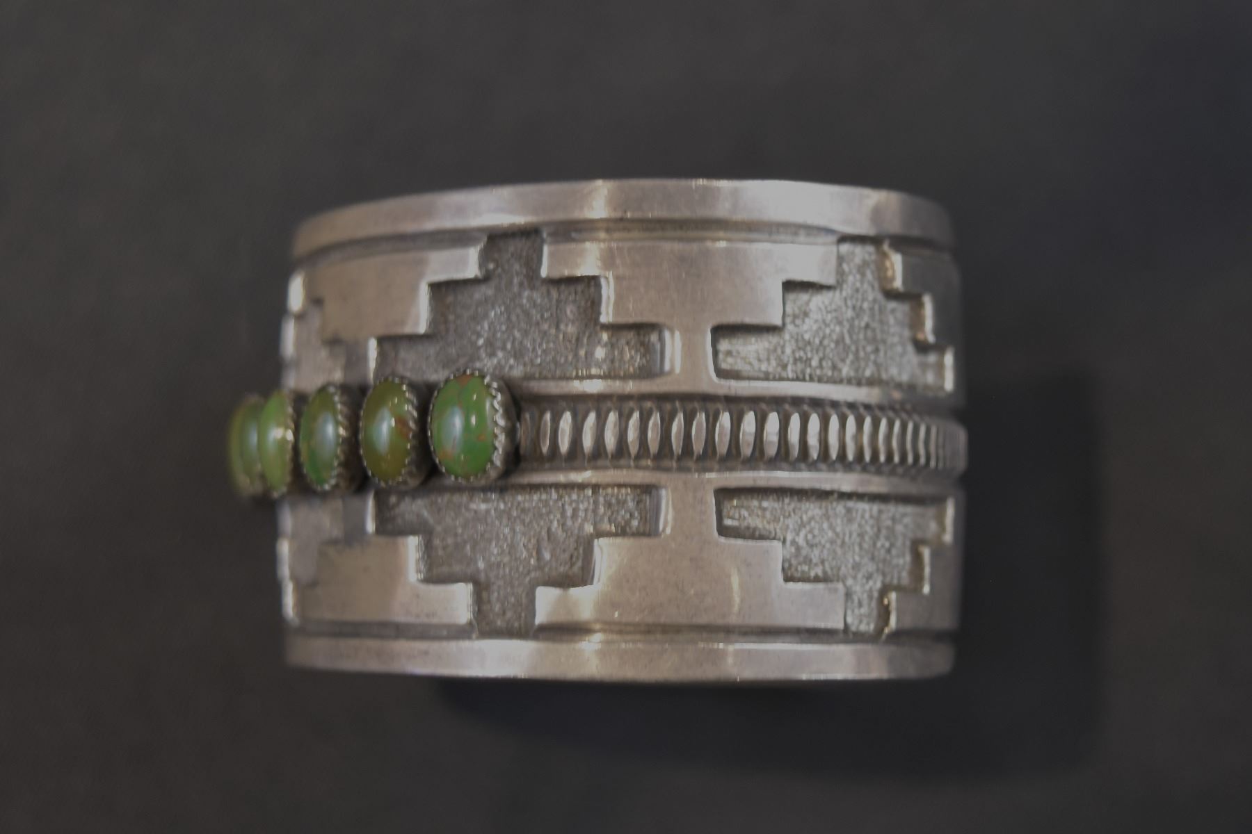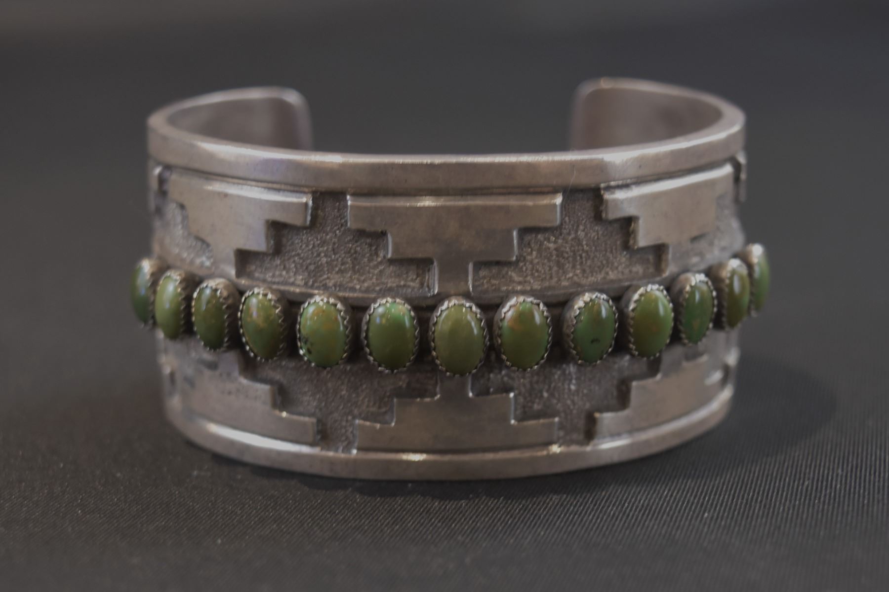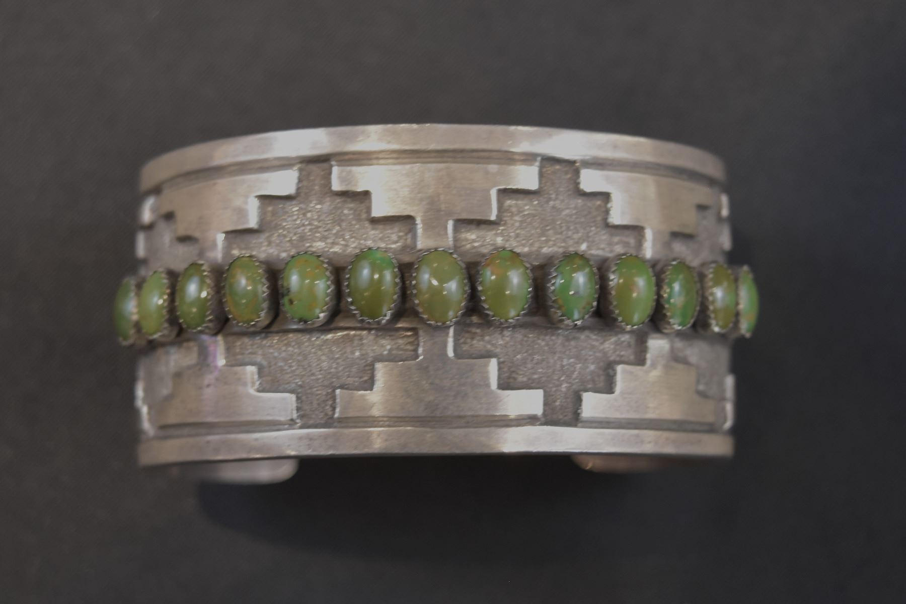 Sterling Silver Cuff with Row of 13 Small Turquoise Stones, Marked Navajo R Martinez