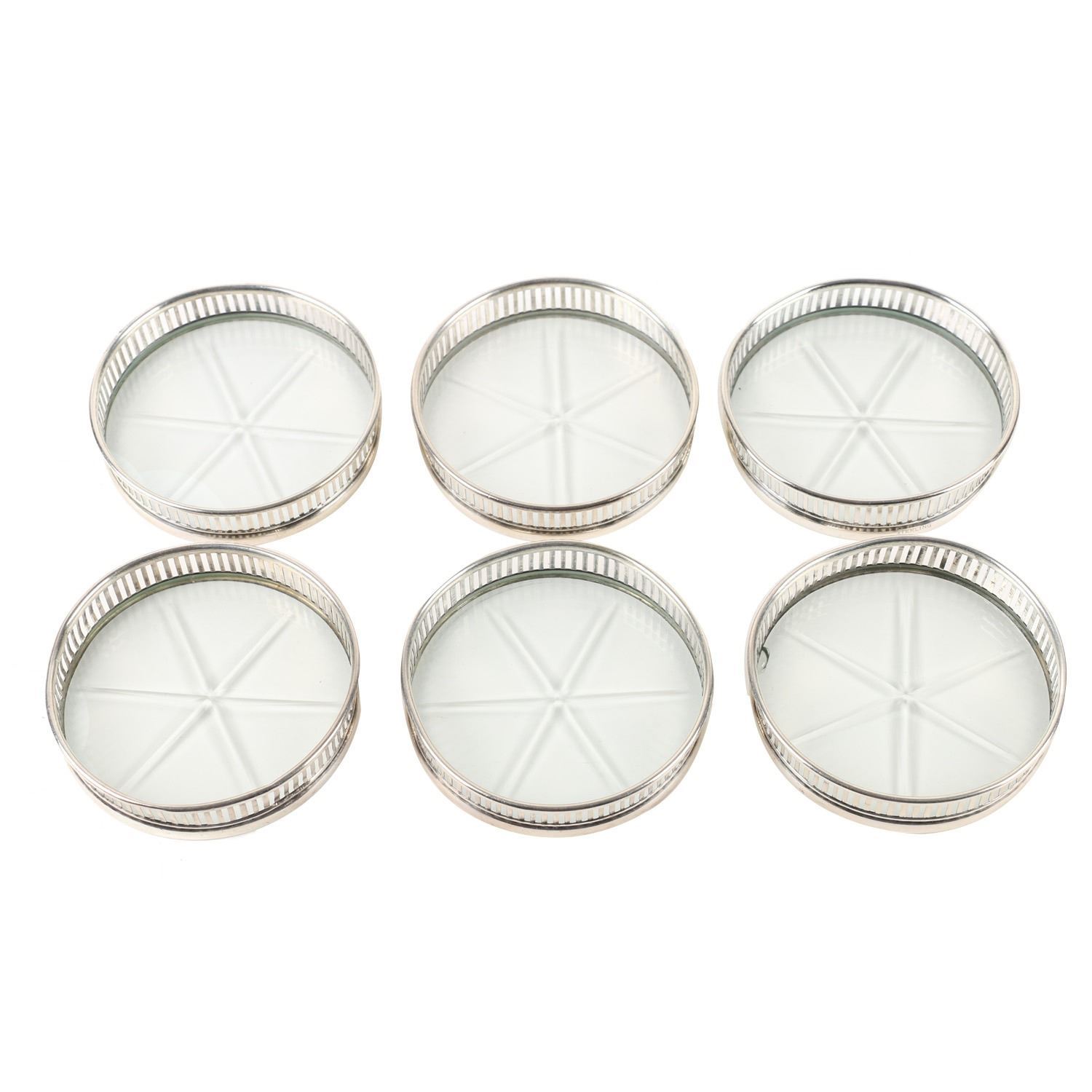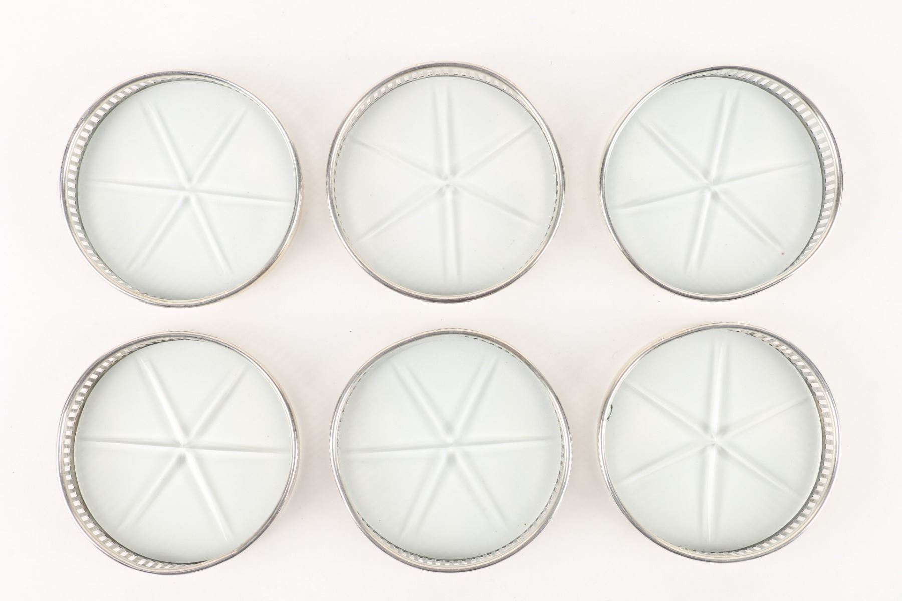 Lot 239 - Six (6) coaster, matching set. Star cut glass base. Each hallmarked "Sterling". 0.75" x 3". Gross weight (including glass), 324g. A few minor edge chips and light bending to the sterling frames. $50-100.