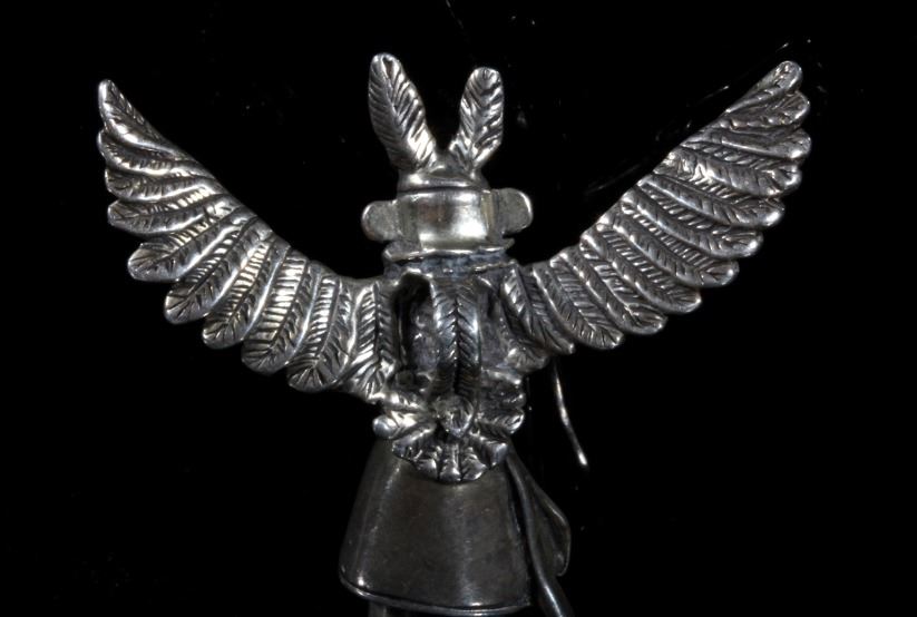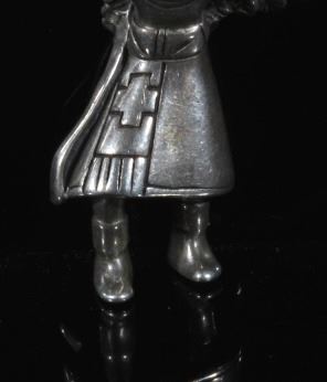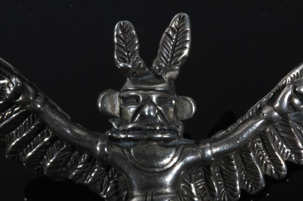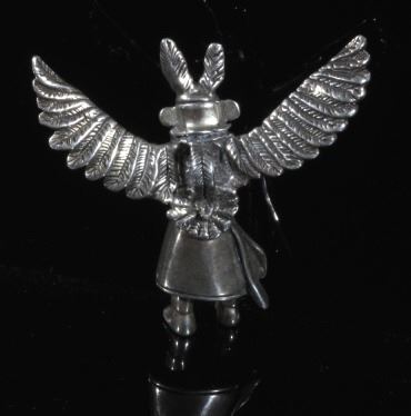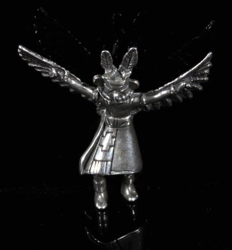 For your consideration is a sterling silver dancing eagle Kachina pendant. This pendant has an artist signature on the bottom and is marked 925 confirming the silver purity. The Kachina show's amazing craftsmanship especially in the feather detail. The figure is adorned with traditional ceremonial garment. An eagle Kachina represents strength & power. He is the ruler of the sky and the messenger to the heavens. The pendant weights 11.8 grams and is 1.5" x 1.5".