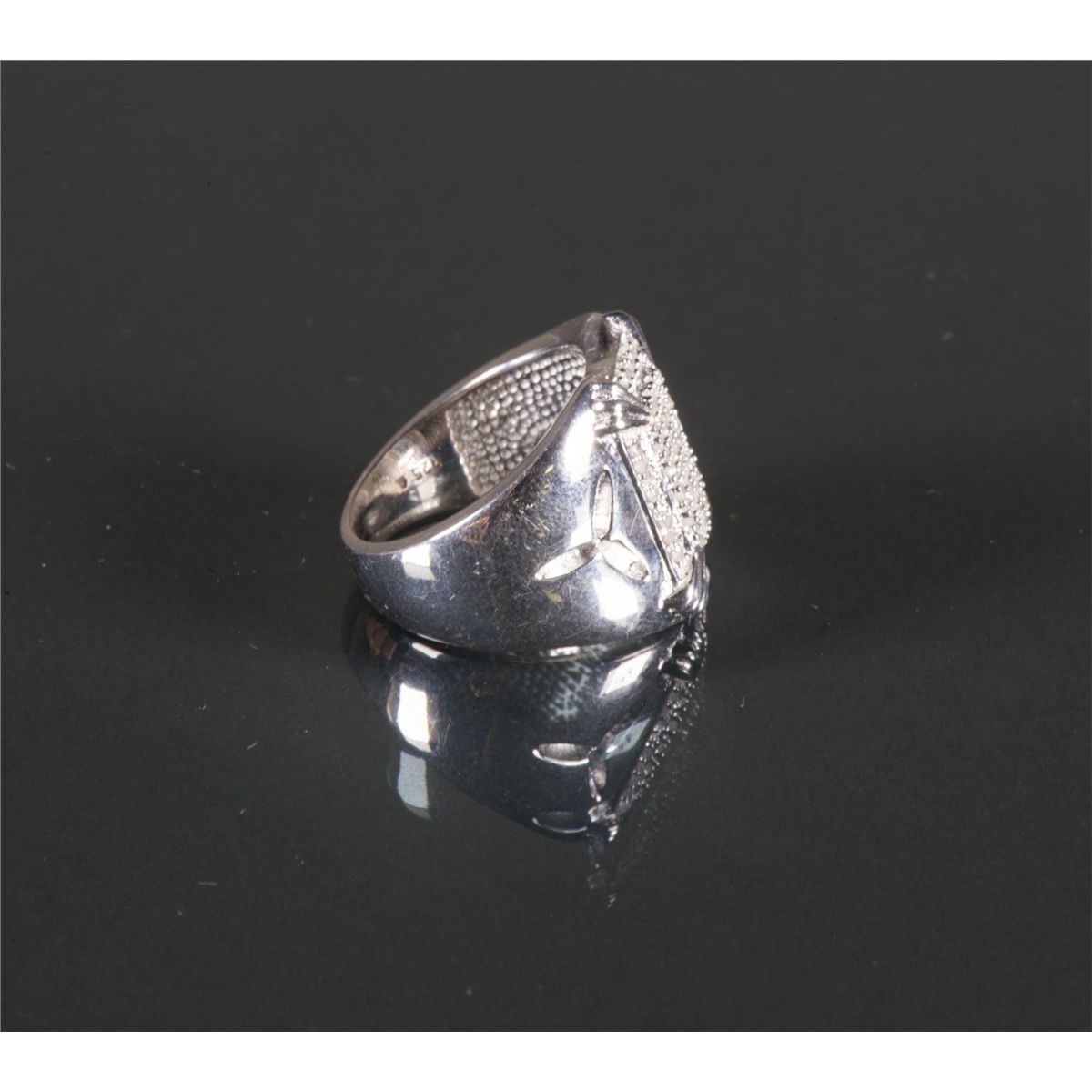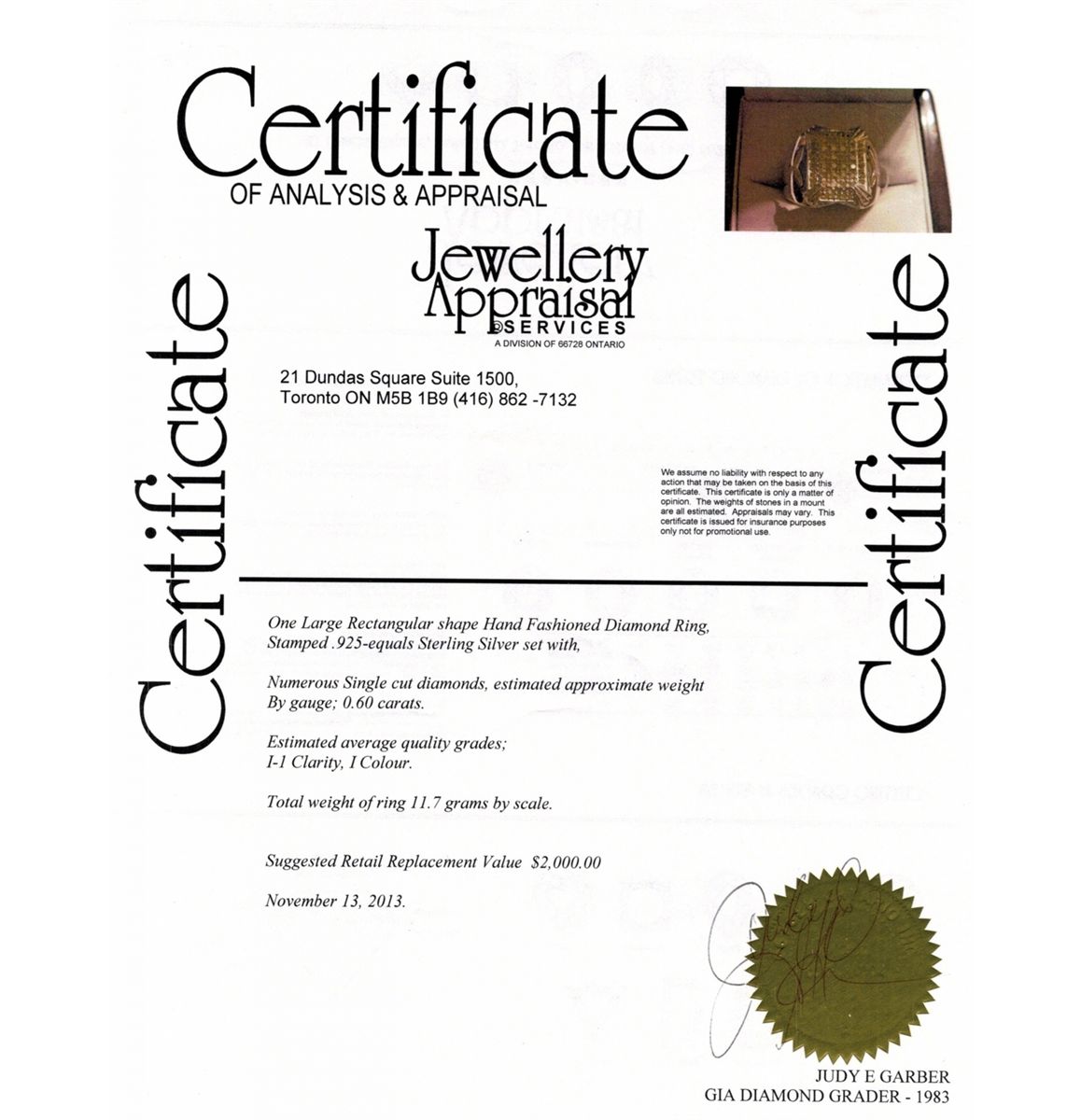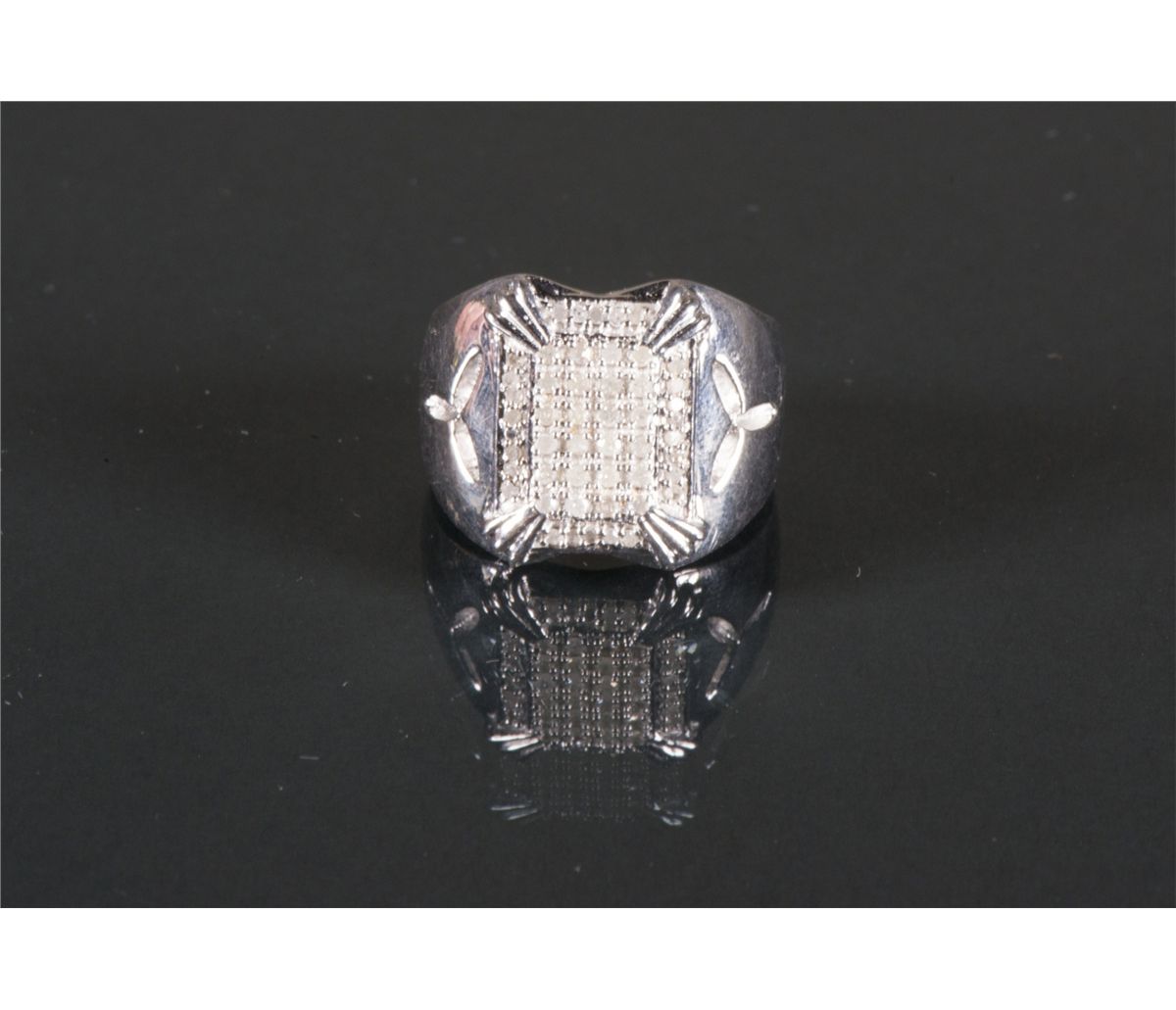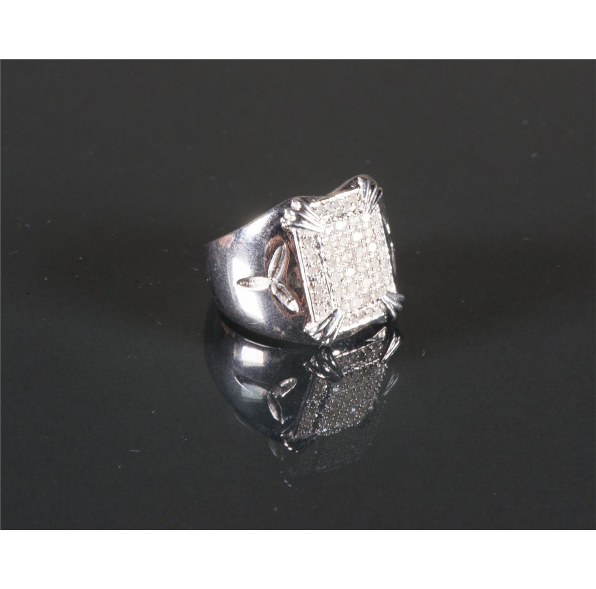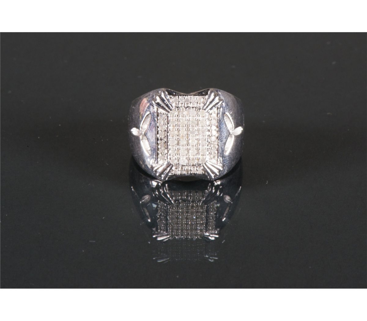 One large rectangular shape hand fashioned ring with numerous single cut diamonds; Ring size: 7.5, 12 grams, Certificate Replacement Value $2000