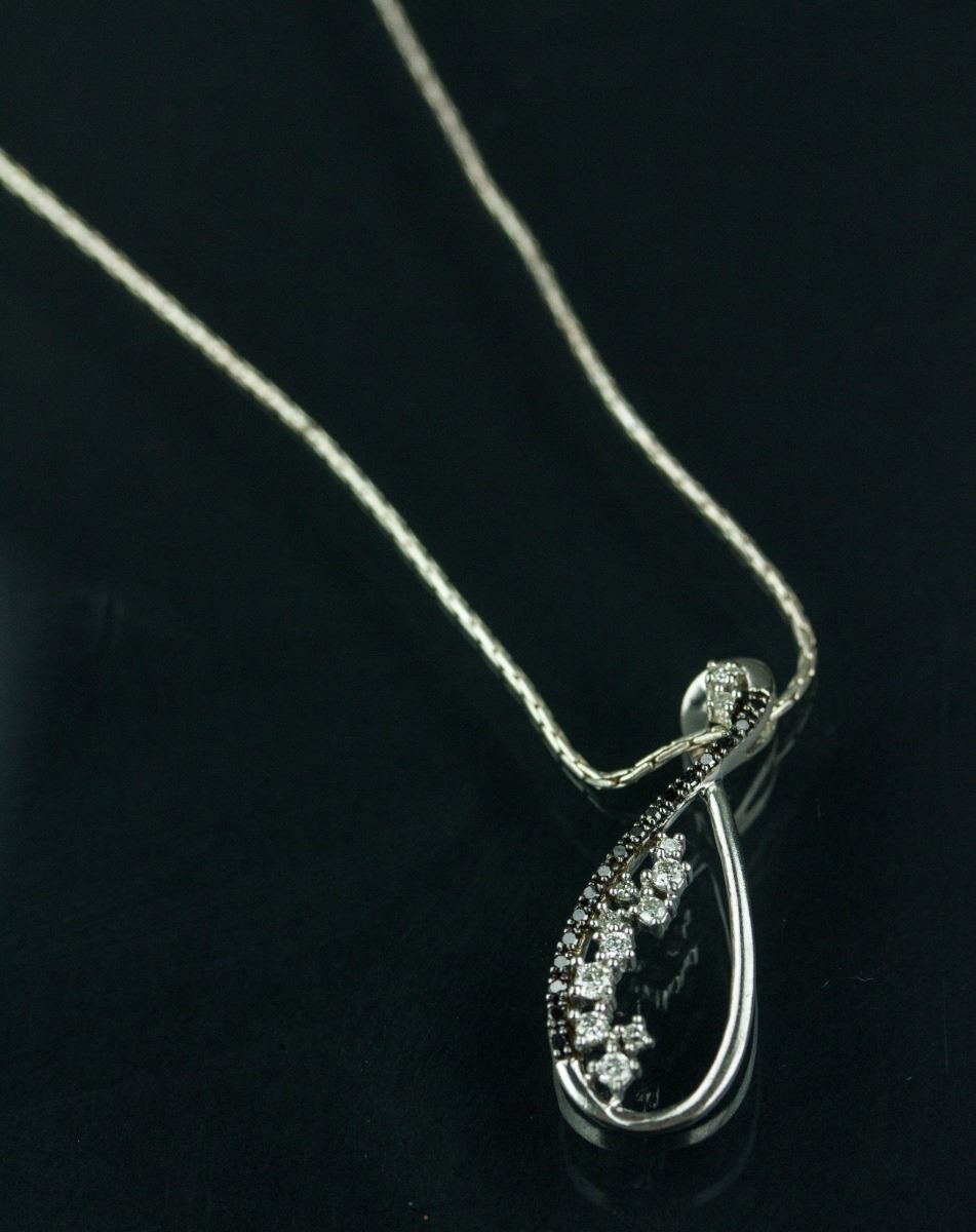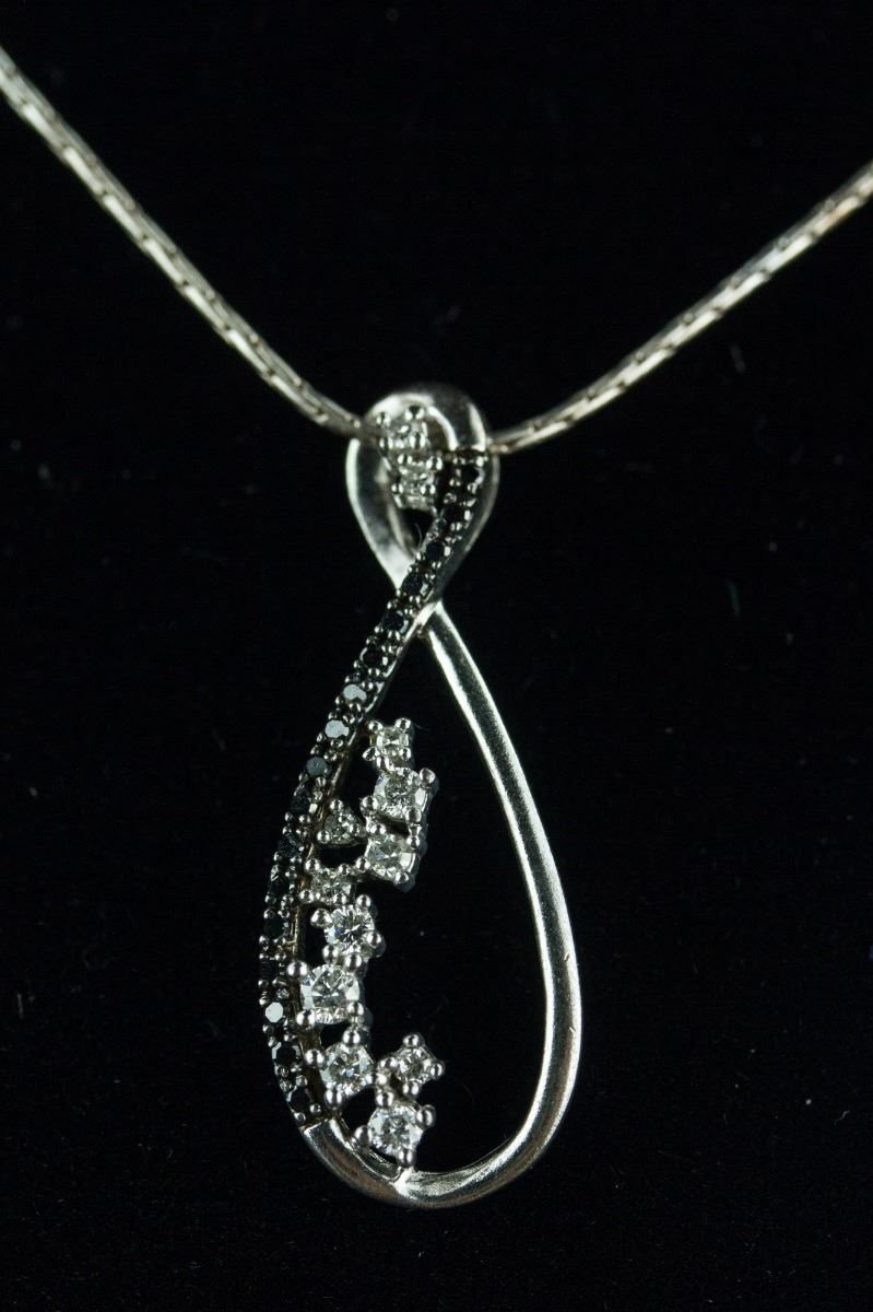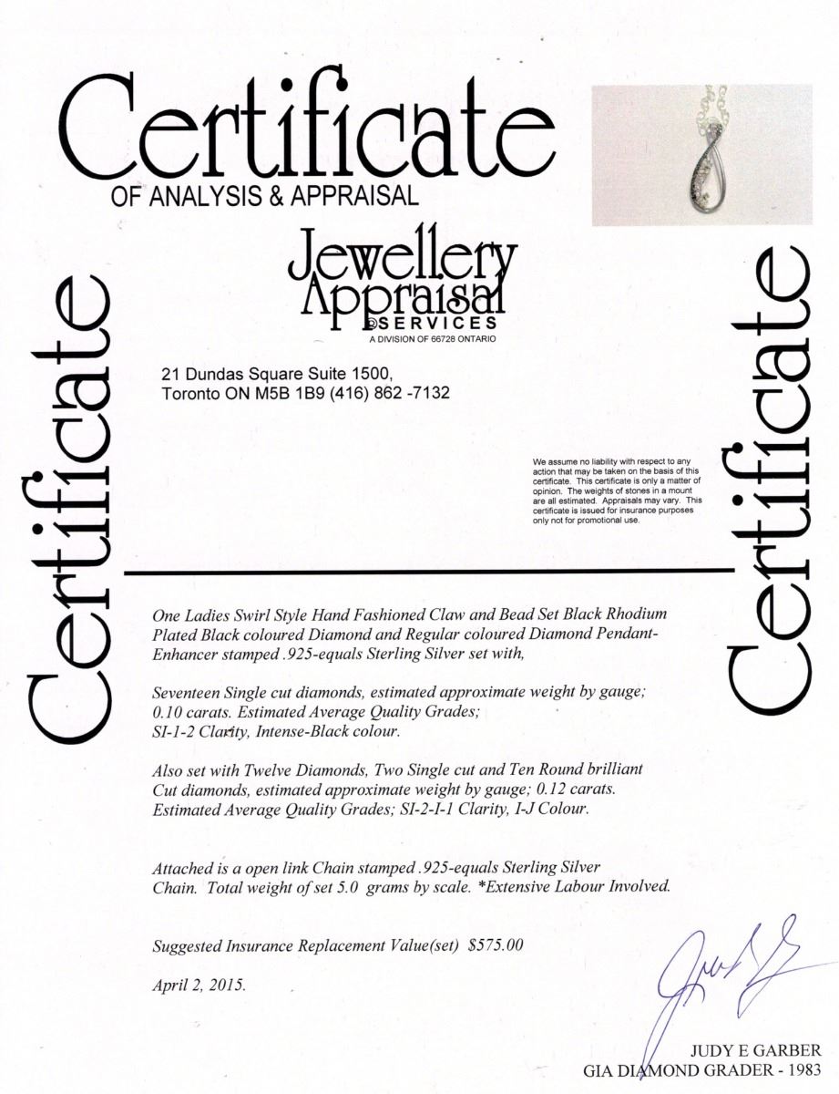 One ladies sterling silver swirl style diamond pendant; comprised of seventeen single-cut black diamonds and set with twelve regular diamonds; certified replacement value $575; 5 grams