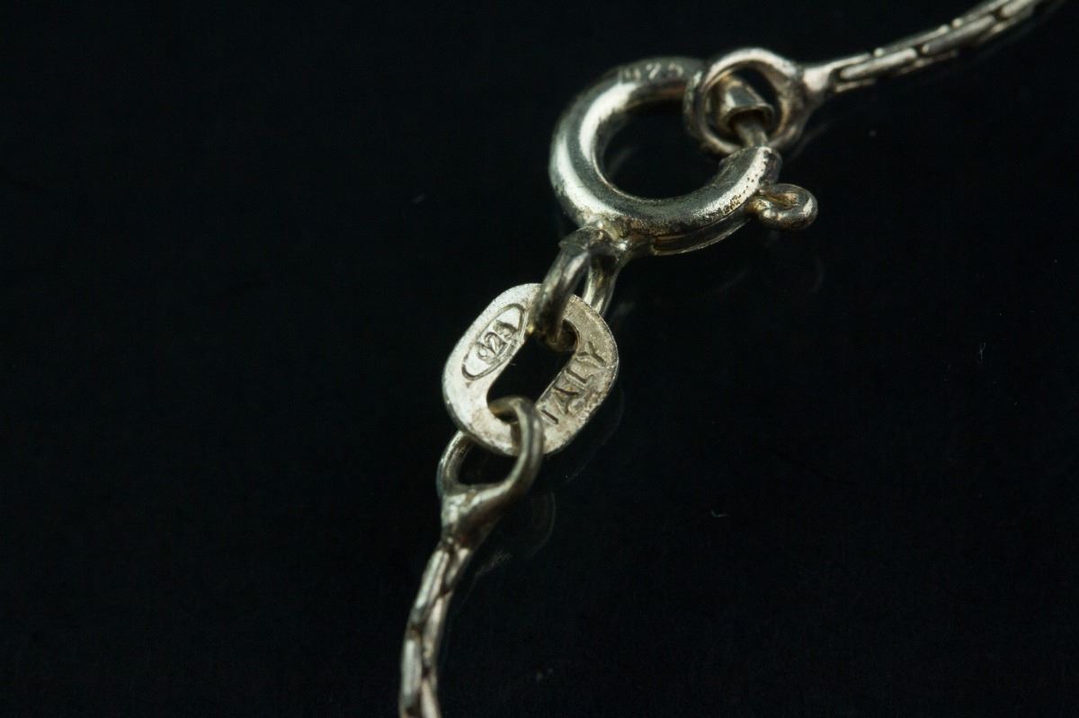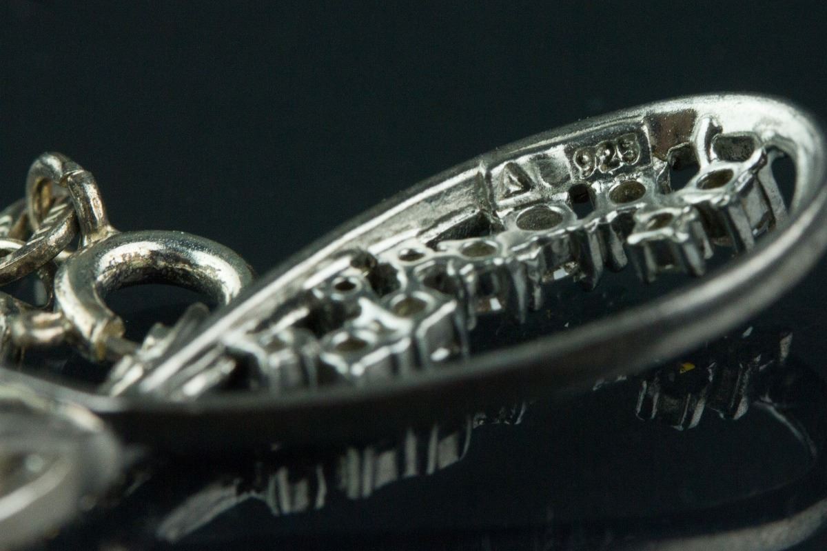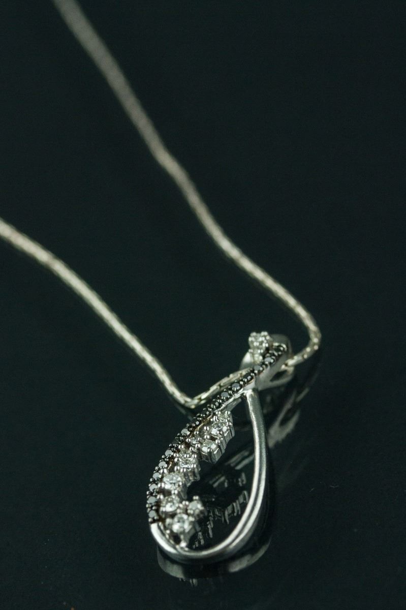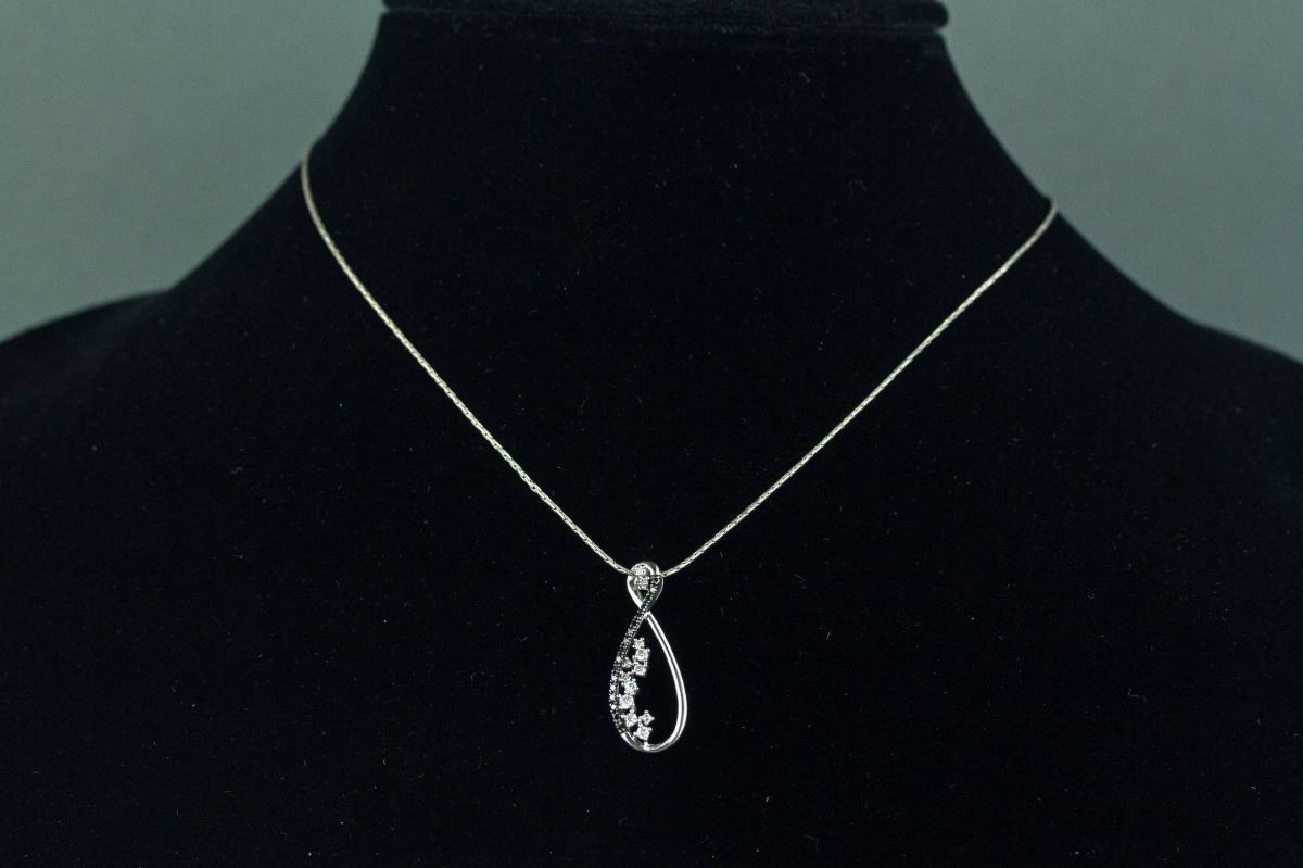 One ladies sterling silver swirl style diamond pendant; comprised of seventeen single-cut black diamonds and set with twelve regular diamonds; certified replacement value $575; 5 grams