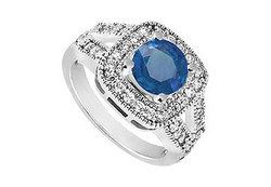 A brilliant-cut round diffuse sapphire is prong-set in a delicate square motif & is haloed by smaller white CZs all around it. Sassy V motif on sides is accentuated with round white CZs. This .925 sterling silver rhodium engagement ring has a total weight (TGW) of 1.25 carats.
