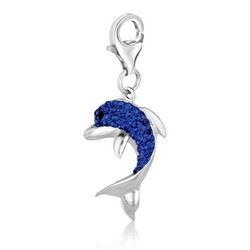 This sterling silver charm showcases a stunning dolphin design adorned with crystal accents in a pretty blue tone. Can be attached to a bracelet with the lobster lock.Rhodium Polish: NoLine Item Type: SilverMetal Name: Sterling SilverMetal Content: 925Style Name: Crystal,Sea LifeLength: 1.50 iWidth: 0.63 i