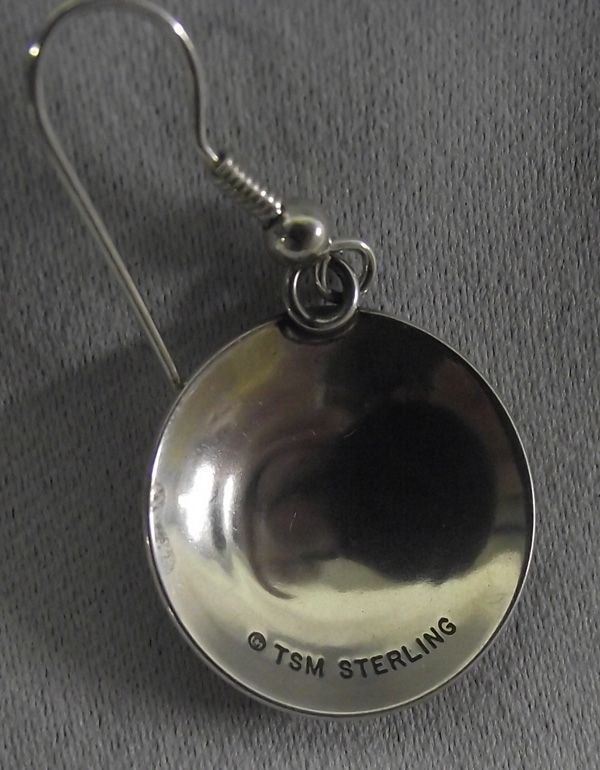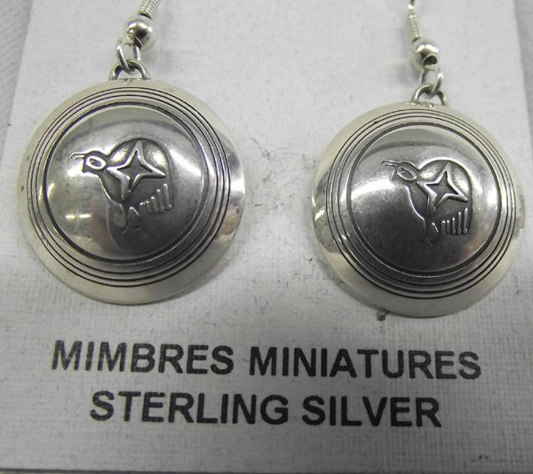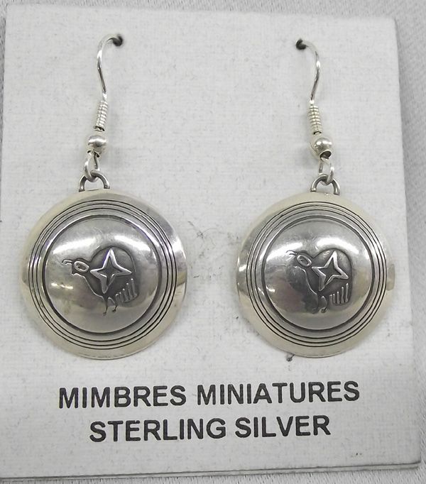 Sterling Silver Earrings - Mimbres Quail Design. These charming earrings have a quail design taken from the pottery designs found on the Mimbres Indian pottery, a culture that lived in southwest New Mexico. The earrings are domed and are 3/4'' diameter and are 1.5''H from top of loop to bottom of earring.