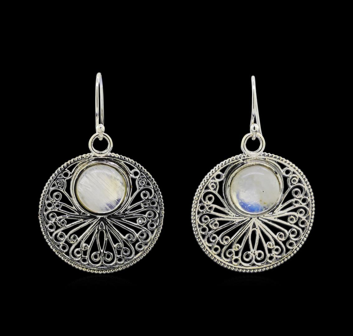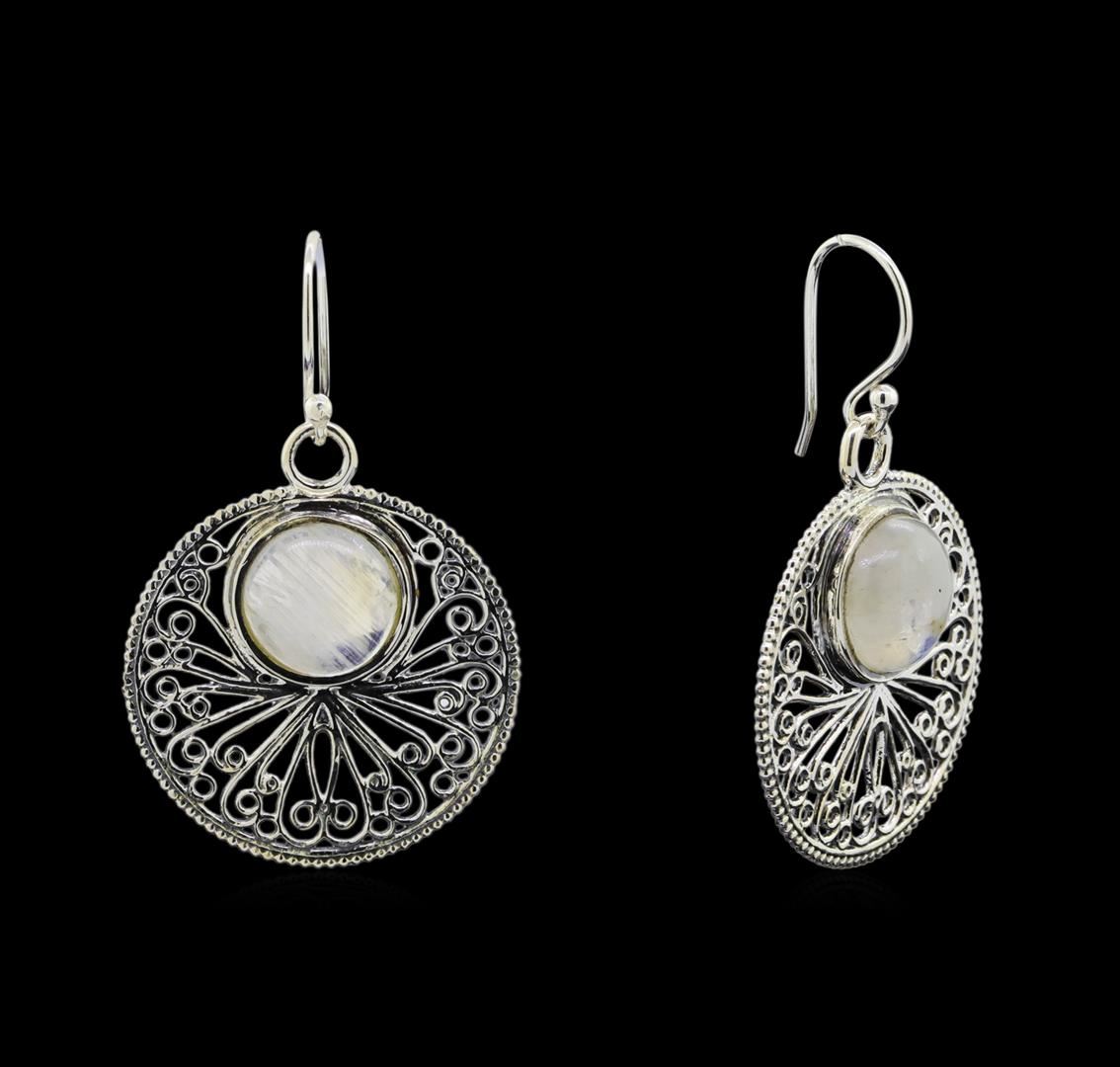 One of a kind high fashion sterling silver Earrings weighing 8.9 grams. Containing: Rutilated Moonstone. This sterling silver promises a lasting shine.