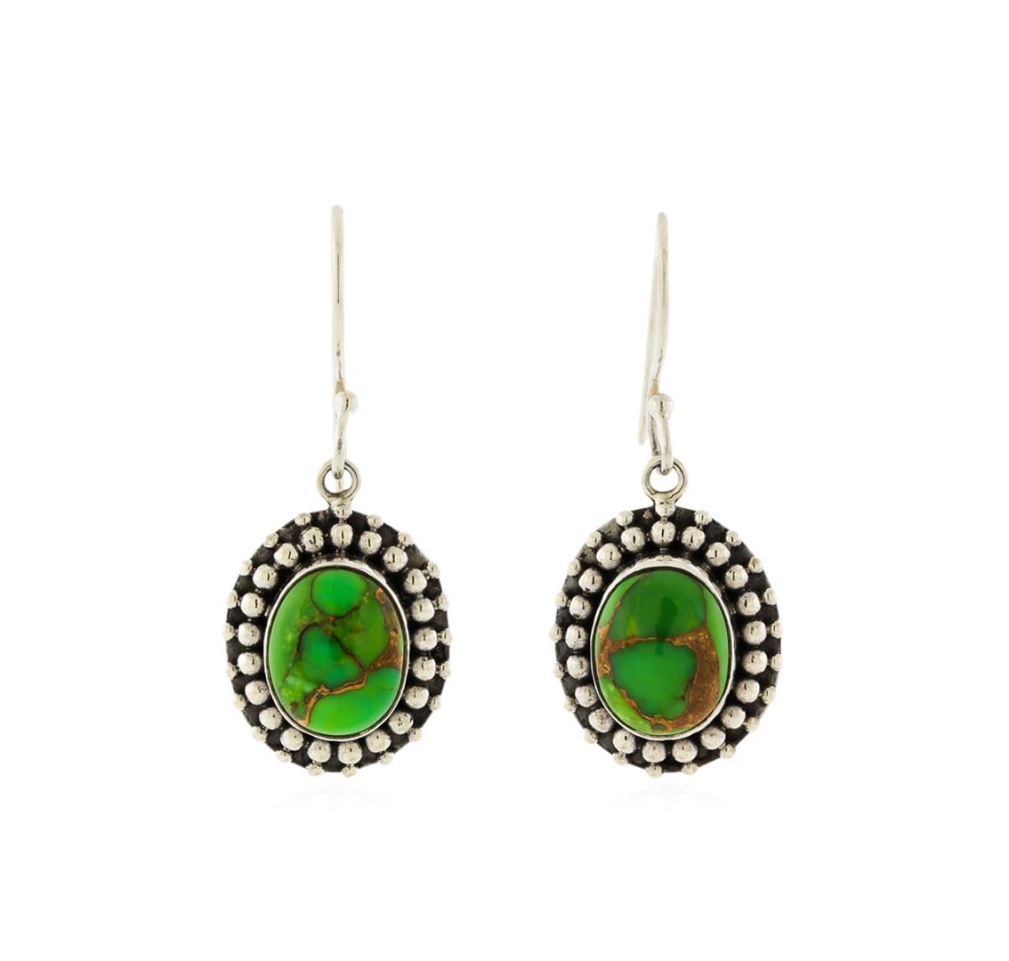 One of a kind high fashion sterling silver Earrings weighing 5.7 grams. Containing: Dyed Green Turquoise. This sterling silver promises a lasting shine.