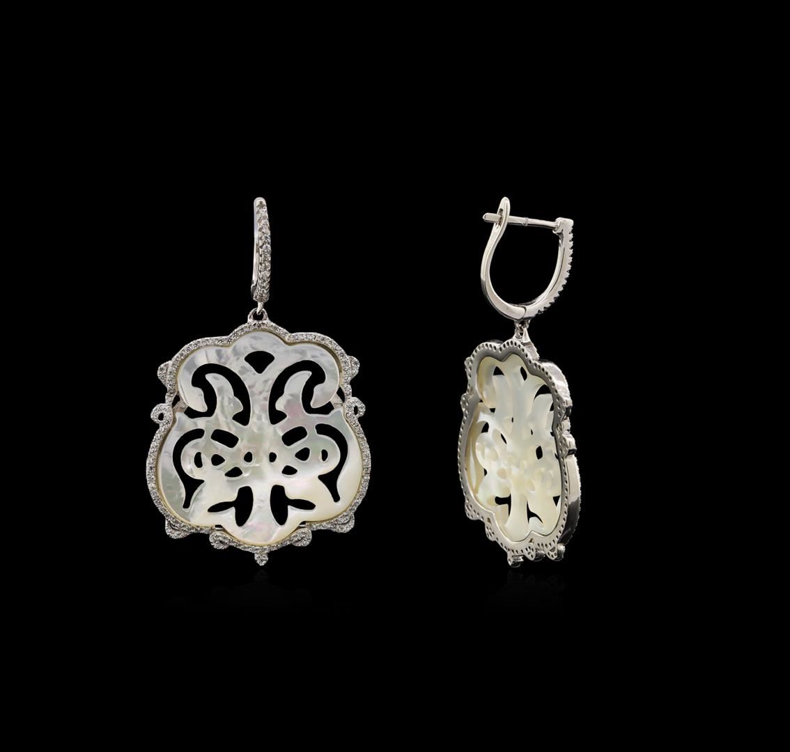 One of a kind high fashion sterling silver Earrings weighing 11.5 grams. Containing: Mother of Pearl, Cubic Zirconia. This sterling silver promises a lasting shine.