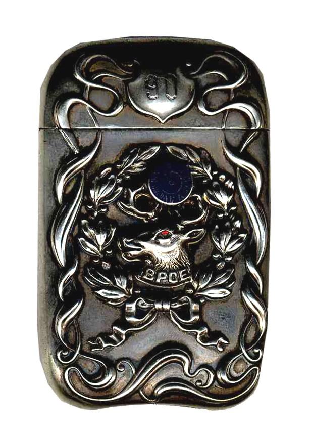 Sterling silver Elk matchsafe, with BPOE (The Benevolent & Protective Order of Elks) logo across Elk's neck. Art Nouveau-style matchsafe with gilded interior and hidden hinge, features foliated design with elk's head and eleventh hour blue enamel clock. Elk's eye made from cabochon ruby. Interior marked ''F'' and ''Sterling.'' Matchsafe measures 1.5'' x 2.5''. Mint condition.