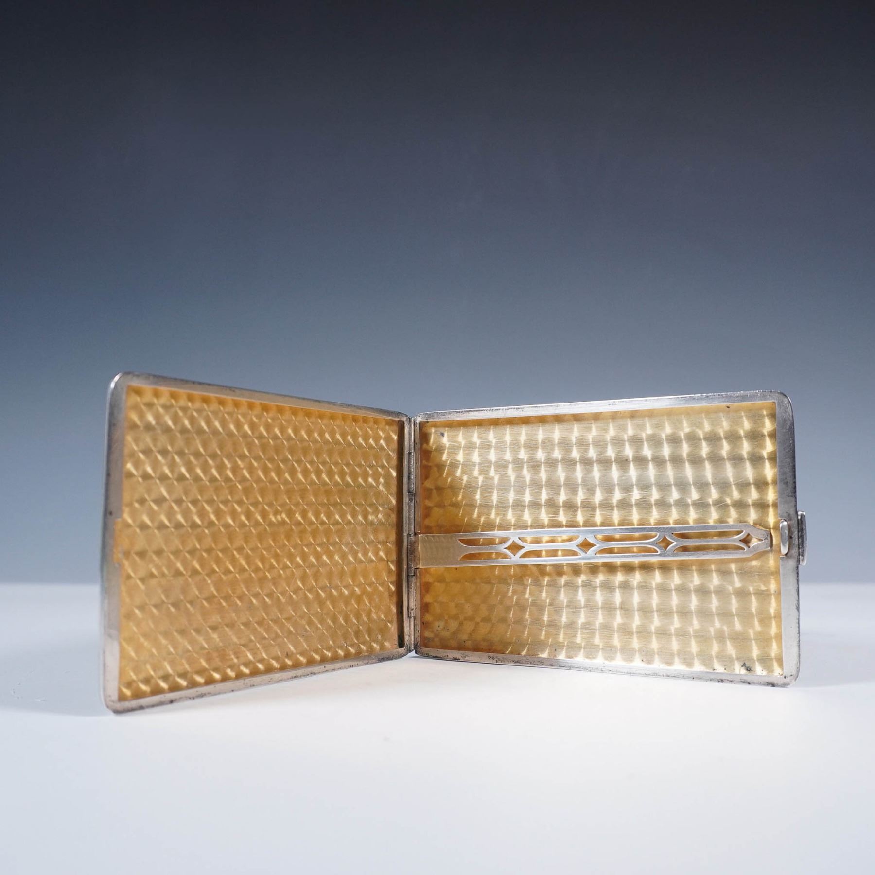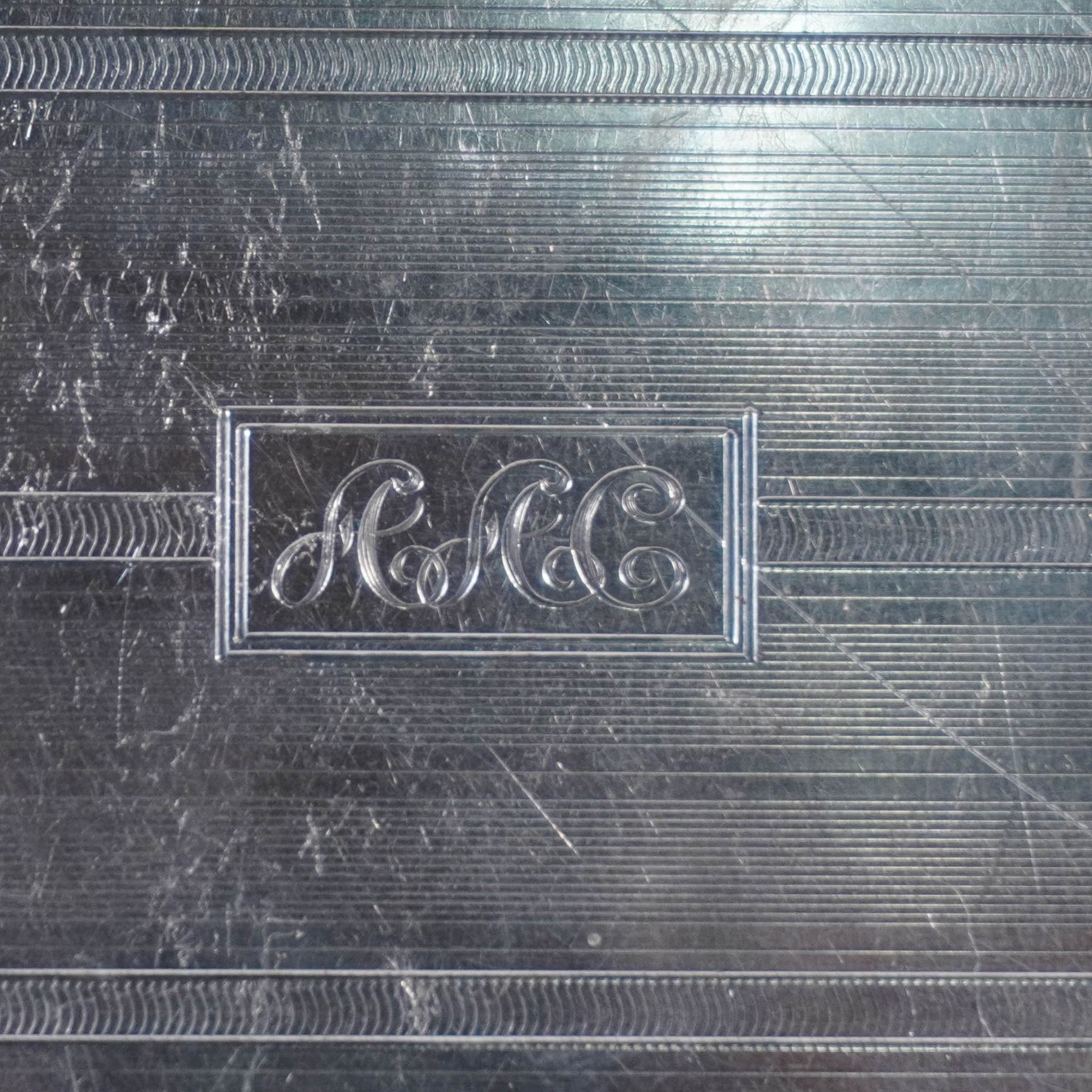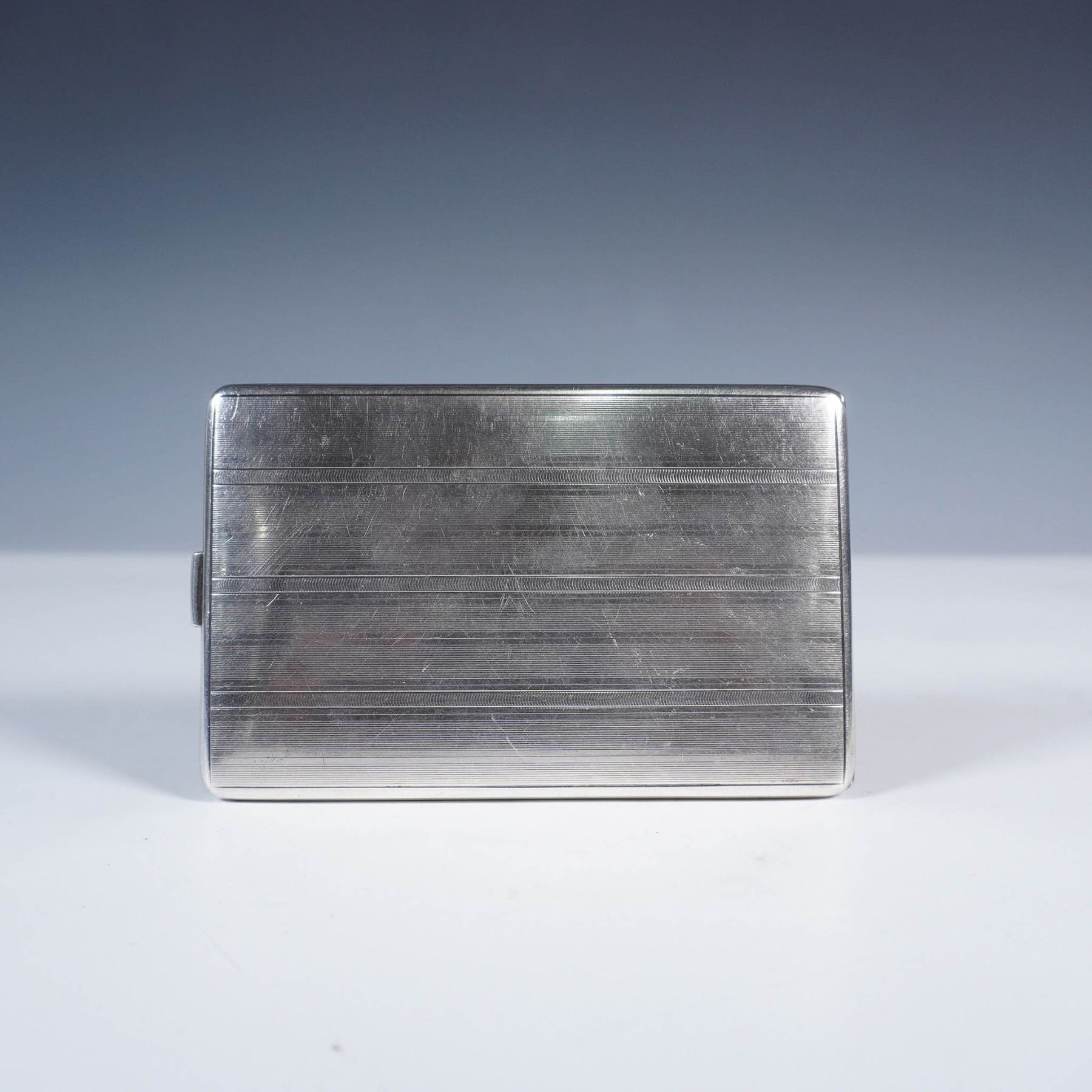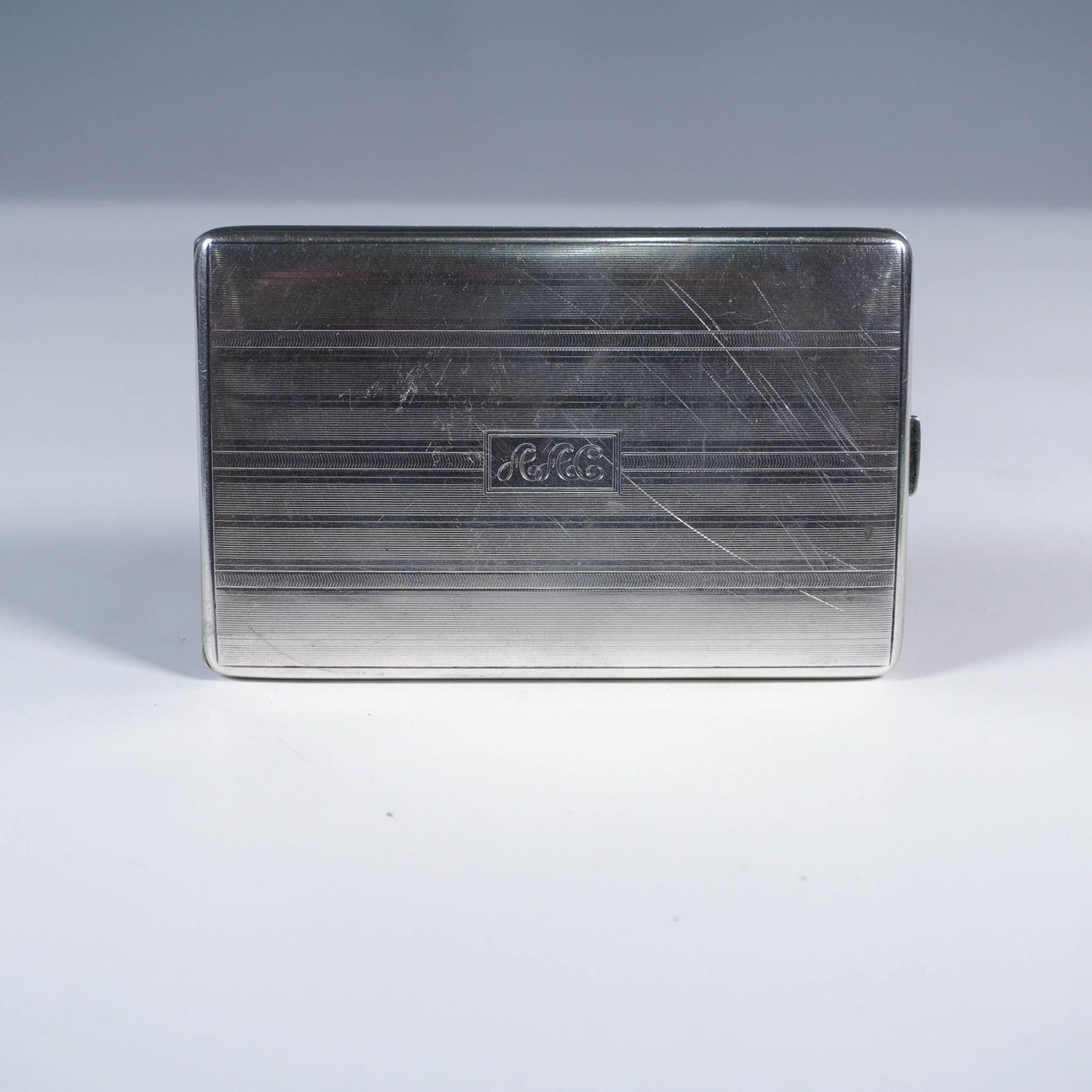 Marked sterling, this rectangular silver case features an elegant engine-turned design finely machined, repetitive lines that add a refined texture while minimizing visible wear. The interior is gold-washed with a decorative clasp, and the front bears a monogram. Likely used as a cigarette or card case, it reflects classic mid-century styling with subtle sophistication. Weighs approximately 136g. Measures 5"L x 3"W.