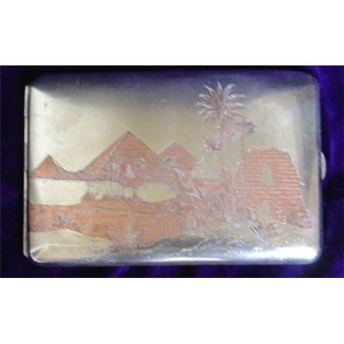Sterling silver engraved case of camels, pyramids, palm trees, the desert.Engraved in copper and other metals, this case is decorated on all sides. Originally for cigarettes, this would now make a lovely card card. Hallmarked sterling on the bottom inside.It measures 4 3/4" by 3 1/8". It is in very good antique condition.