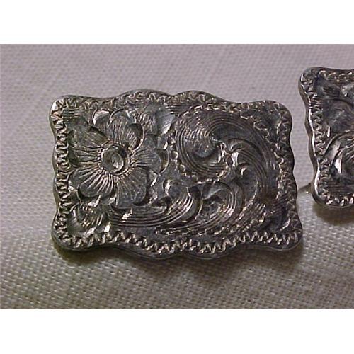 Very excellent pair if floral engraved cuff links of sterling silver. They have a western appeal to them. They measure 1" long. <p> The condition is good. Old patina is present. As well as being marked on the back sterling silver it says "overla". I think it is suppose to say "overlay".