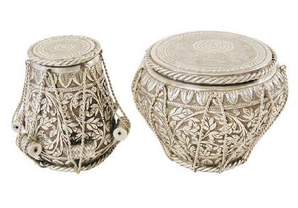 Sterling Silver Exclusive Decorative Musical Drums (Tabla ) Set -with Hand Made Heavily Decorated weighs 11.25 Troy Oz (350 Grams) Approximate "Timeless Treasure" by Shakuntalam Silvercraft.