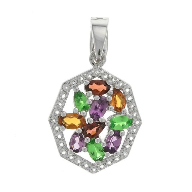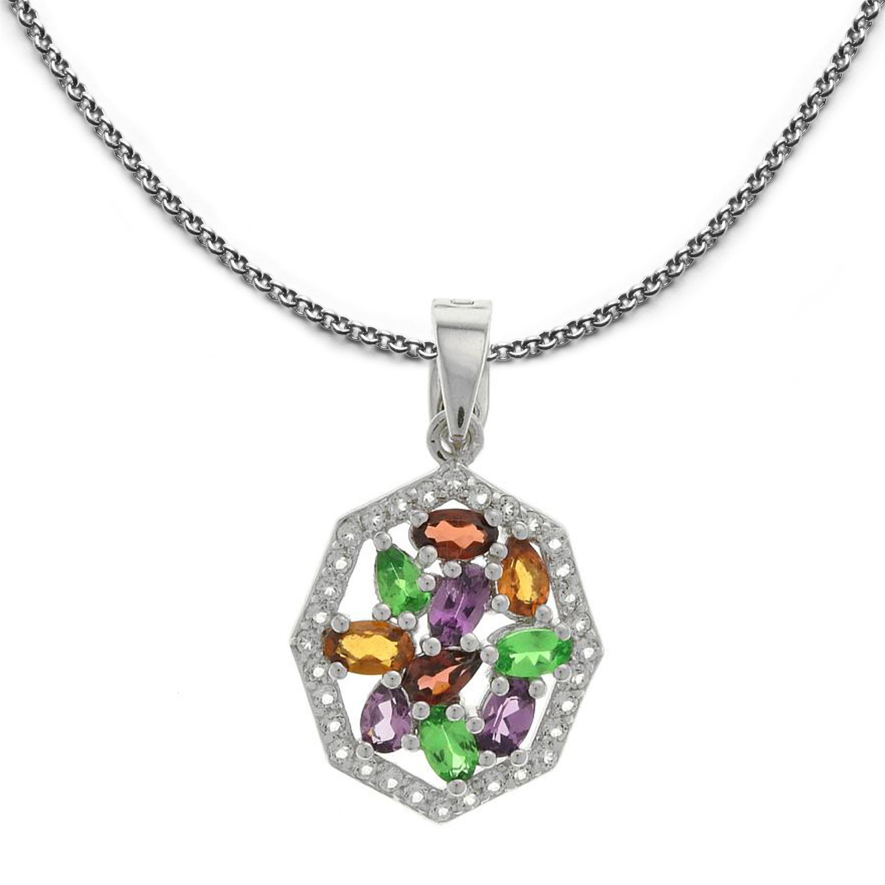 Looking for something new, different and truly unique for your collection? Pangea Mines has the answer with this impressive pendant necklace from the Treasured Gems Collection. A lavish collection of genuine gemstones—exotic green, purple, hessonite, and Mozambique garnet and white topaz—embellish a setting of gleaming rhodium over sterling silver to create a truly eye-catching design.