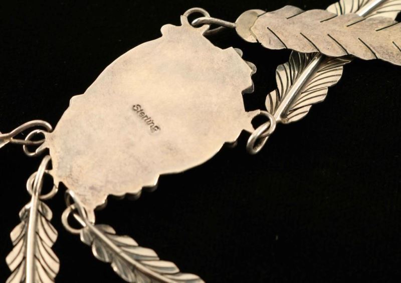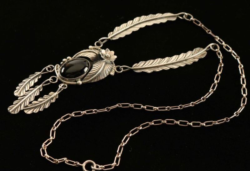 Pendant with black oval stone and sterling floral and feather motif with a large feather to each side and three silver feather dangles. Marked 'Sterling'.