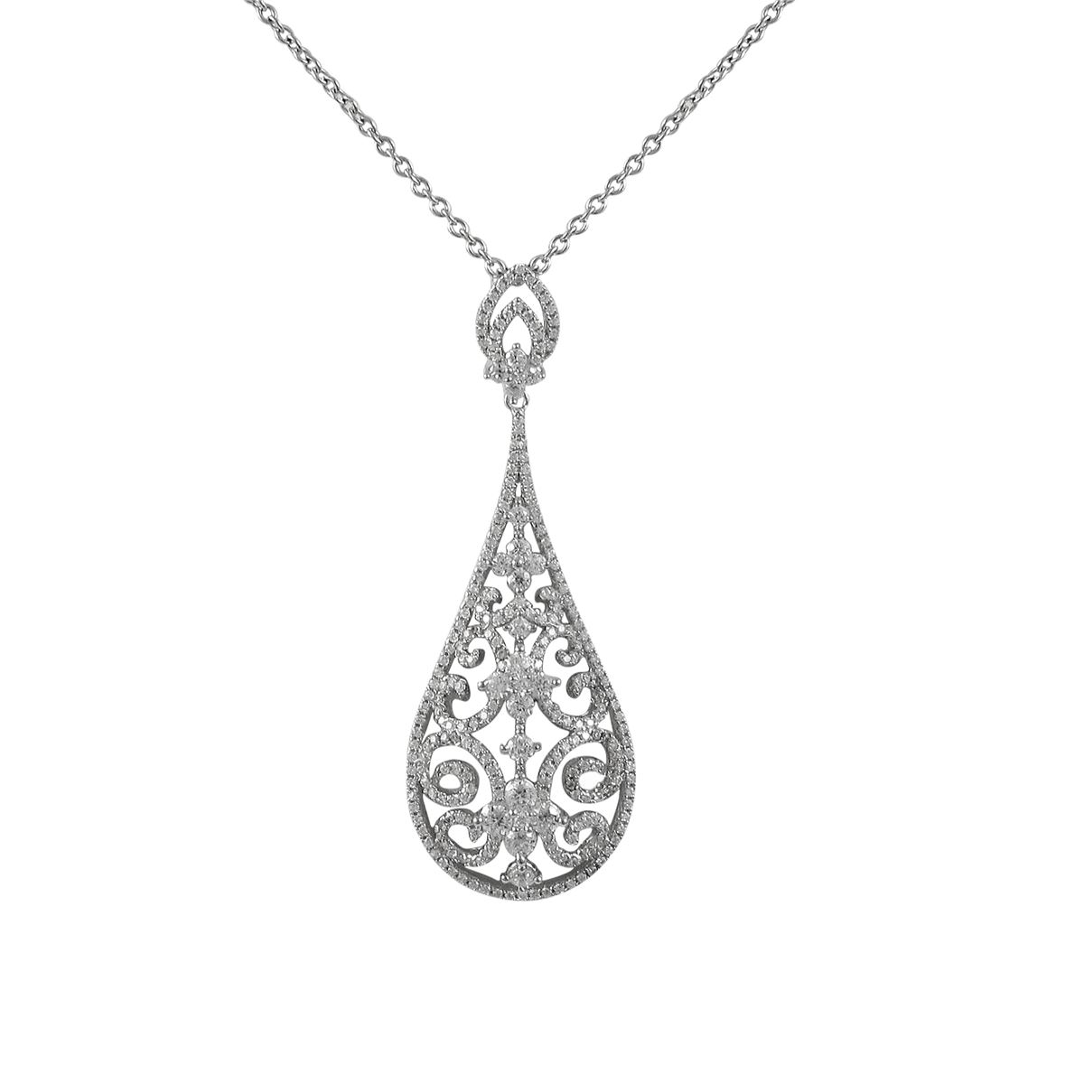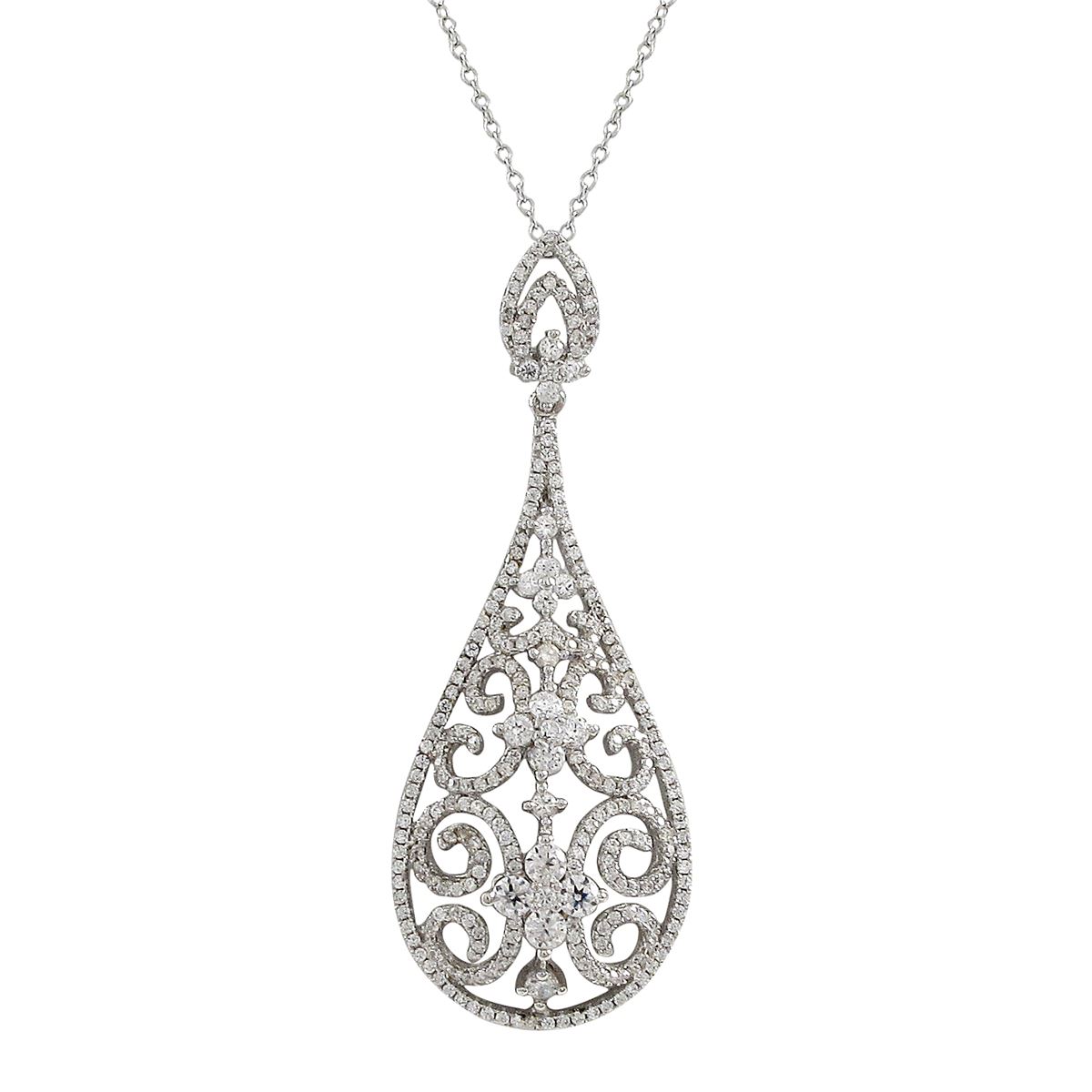 Sterling Silver Filigree Teardrop Pendant With AAA Czs. 2.34" Long.