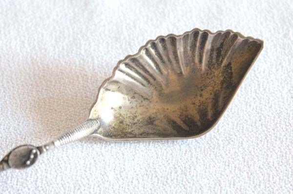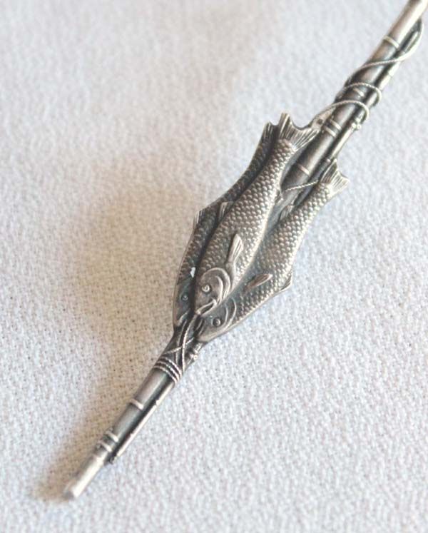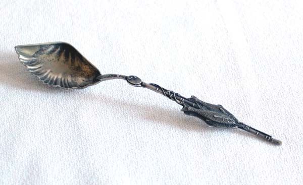 Sterling Silver Fishing Rod Spoon, measures 5''L x 1''W, charming sterling silver souvenir spoon featuring a cane fishing pole with a string of three fish. The bowl of the spoon is molded to resemble a clam or mussel shell with the word, this has a beautiful vintage patina, the spoon has detailing on the front and back of the bowl and the handle, for a 3 dimentional look. It appears this spoon was made by Watson in the late Victorian era. The company sold its dies and closed its doors in the early 1900s, stamped sterling, faint unreadable hallmark, 12.04g in total wt.