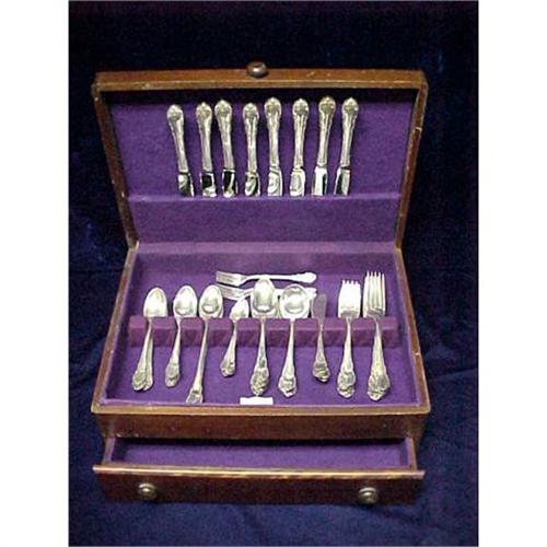 A service for eight of sterling silver flatware by Lunt in the pattern Modern Victorian #2600. This 88 piece service consists of 8 each of the following: Modern Hollow Knife ? 8 inches, Fork ? 7 ¼ inches, Salad Fork ? 6 3/8 inches, Cocktail/Seafood Fork ? 7 5/8 inches, Flat Handle Butter Spreader ? 5 7/8 inches, Round Bowl Soup Spoon ? 6 ¼ inches, Place/Oval Soup Spoon ? 6 5/8 inches, Demitasse Spoon ? 4 ½ inches, Iced Tea Spoon ? 7 3/8 inches, and 16 Teaspoons ? 5 7/8 inches. All are stored in a drawered wooden felt lined storage box. The pieces show slight wear, especially at the ends of the handles where they rest on one another during storage. There are two variations of the table knife, four of each. The slight differences are primarily in the shape of the blade; in one the top and cutting edges of the blade blend smoothly into the handle while with the other the blade is slightly wider and the cutting edge is recurved where it attaches to the handle. On the first variation the words ?Lunt, Sterling Handle, Stainless Blade? are engraved on the blade while in the second variation ?Stainless? is engraved on the blade and ?Lunt Sterling Handle? is stamped on the hilt. The box is a dark mahogany stain showing wear and various scratches. The recessed ?hidden? hinges are loose or sprung. The drawer for serving pieces opens smoothly and closes fully. Even though this set of silver has been used, it is in remarkable condition for it's age. Polishes beautifully!