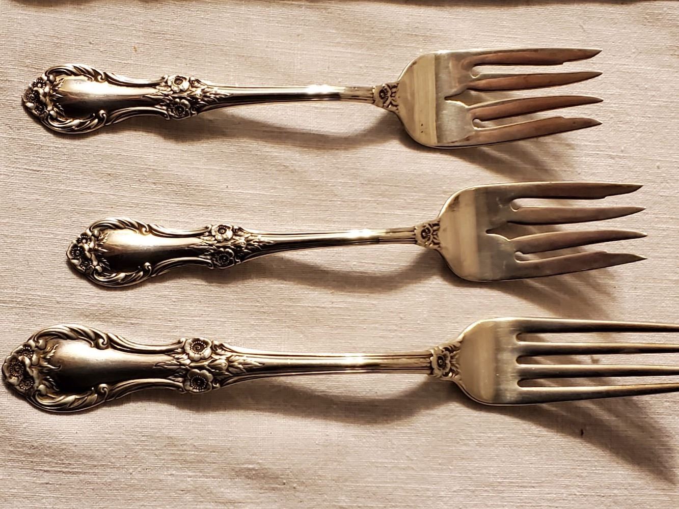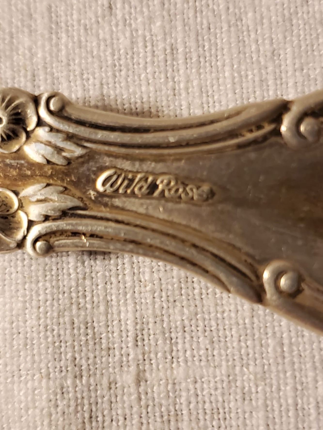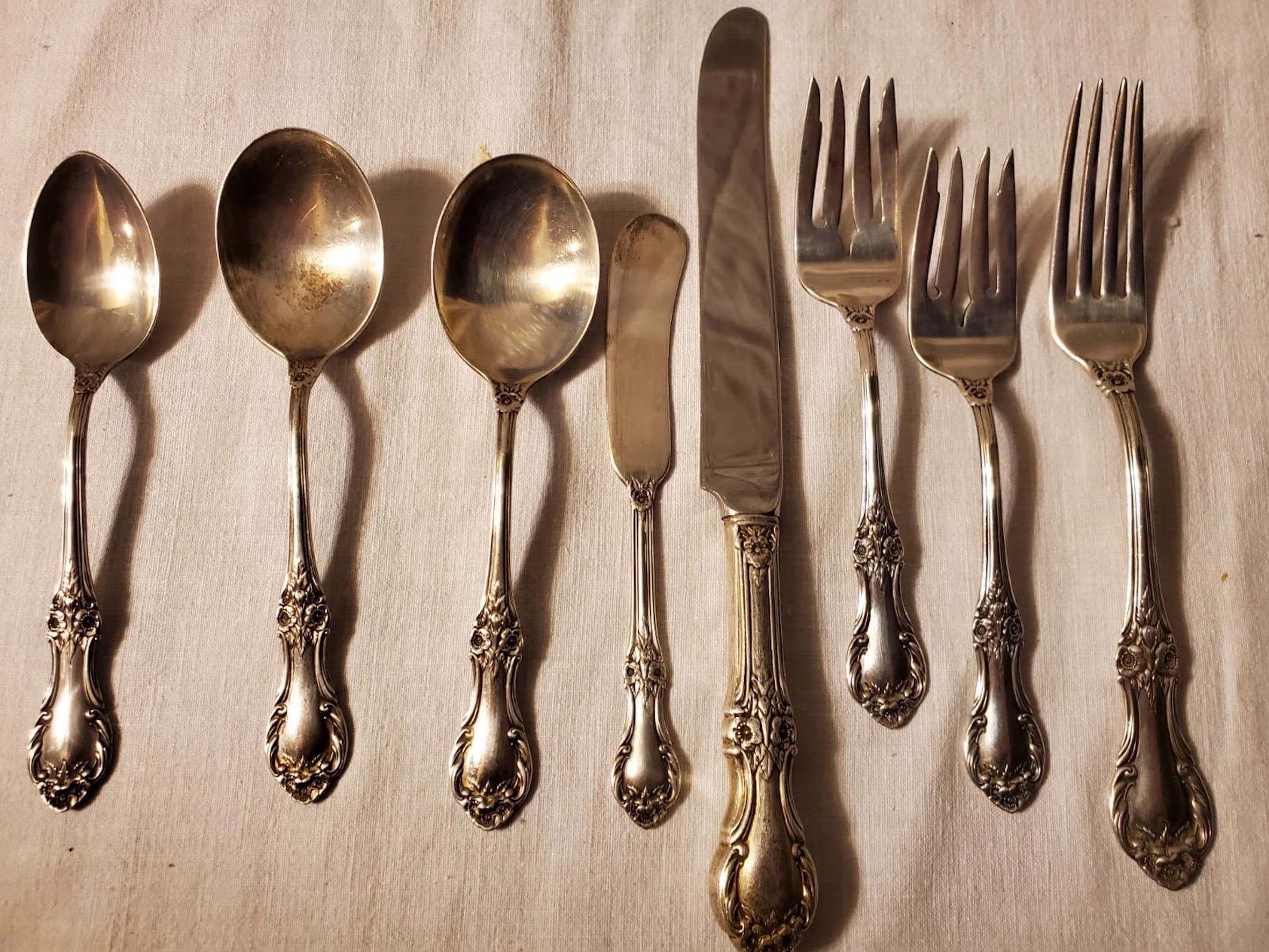 International Sterling, Wild Rose Pattern, one teaspoon, 2 soup spoons butter knife, knife, 2 salad forks, and fork.